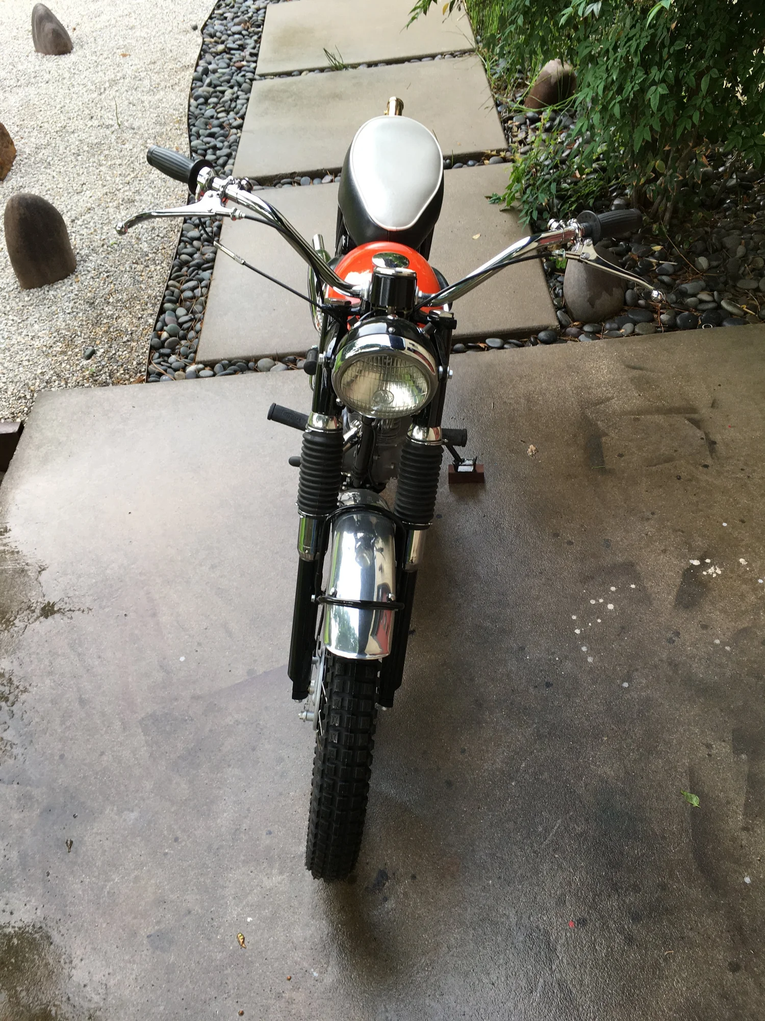 The wide “Western style” bars were shortened by an inch on each side, but still give them enough spread to make off-road riding better. The original handlebar switches were cleaned and restored, and wires were concealed inside the handlebars. The or