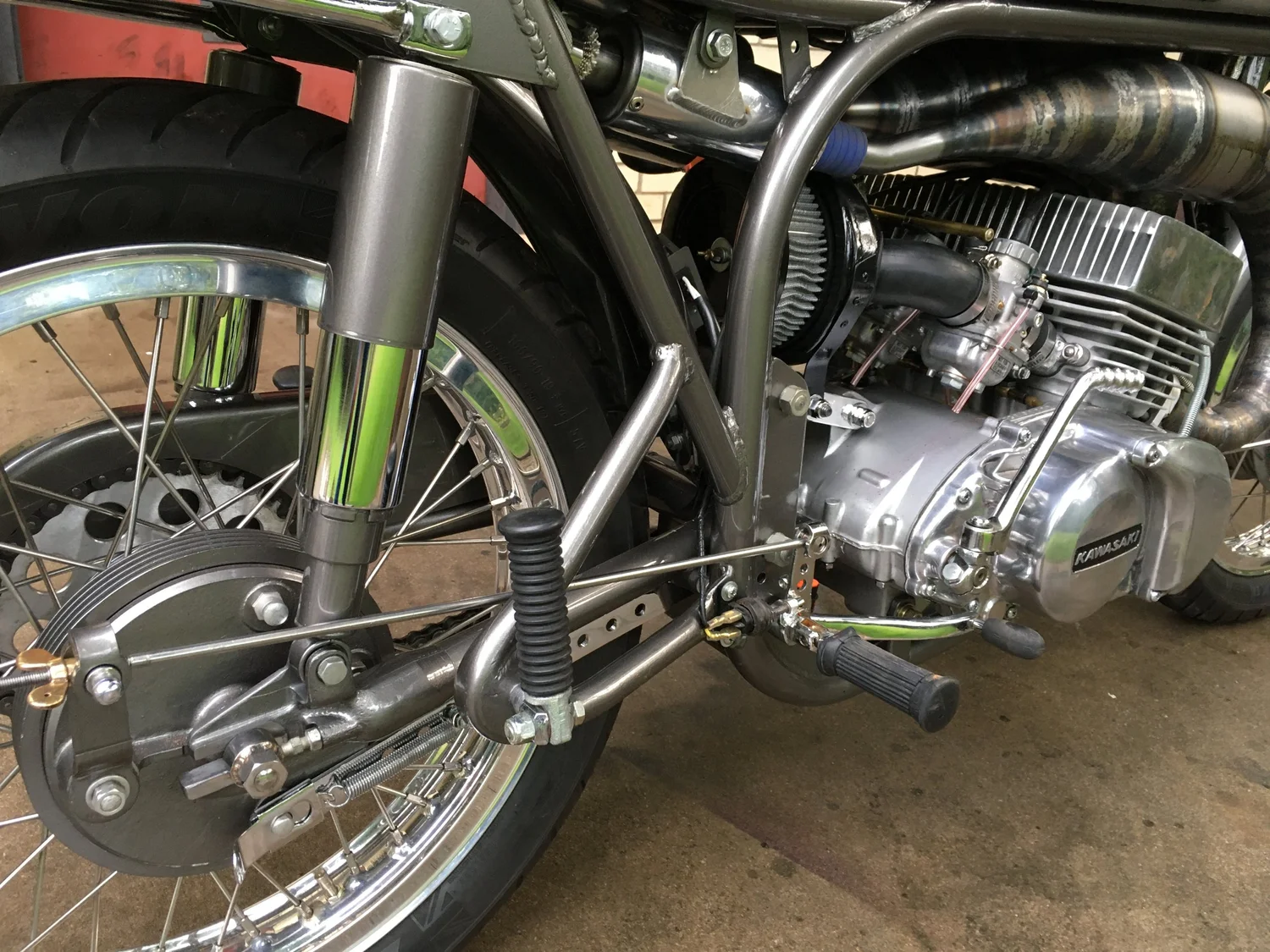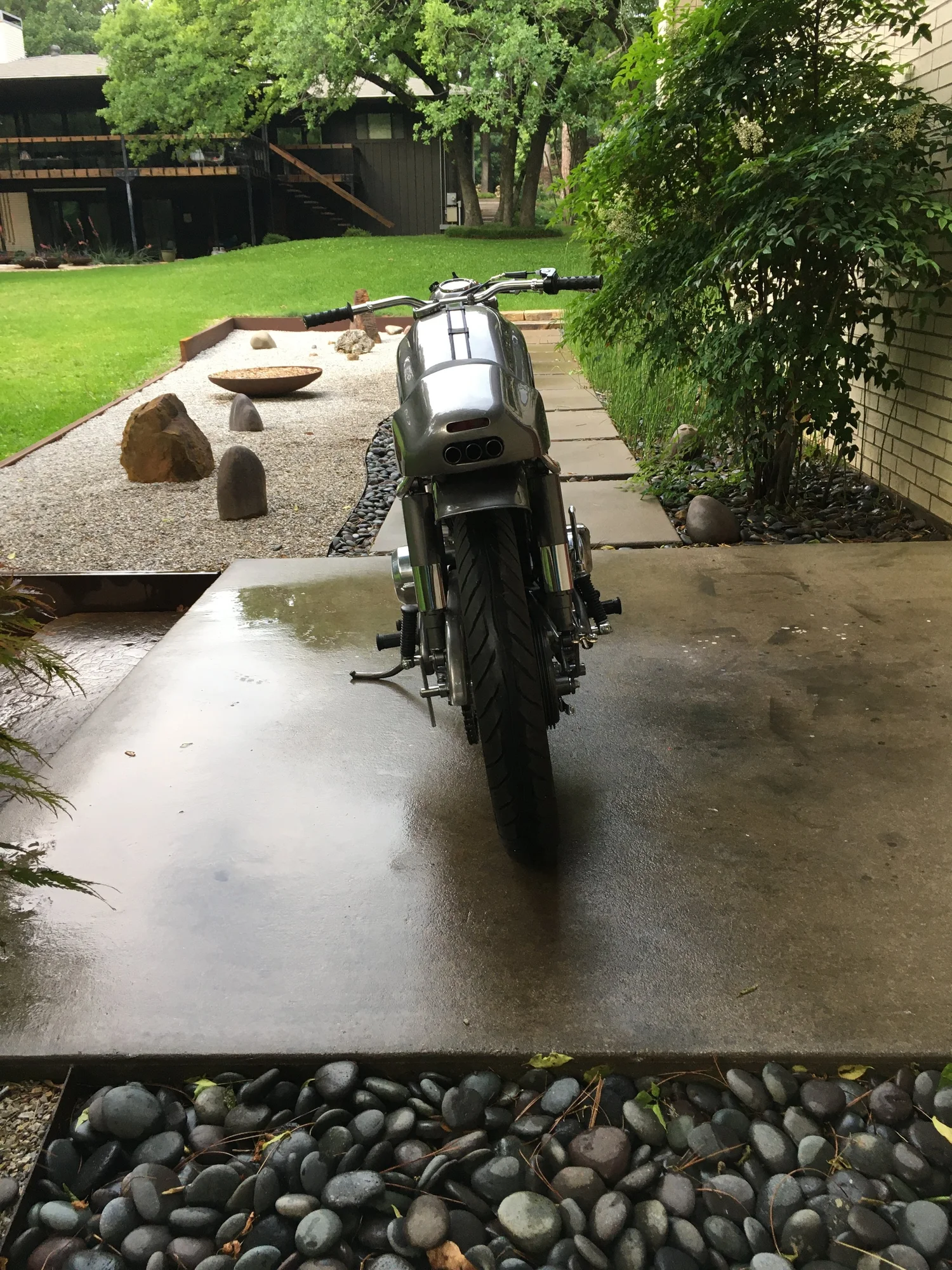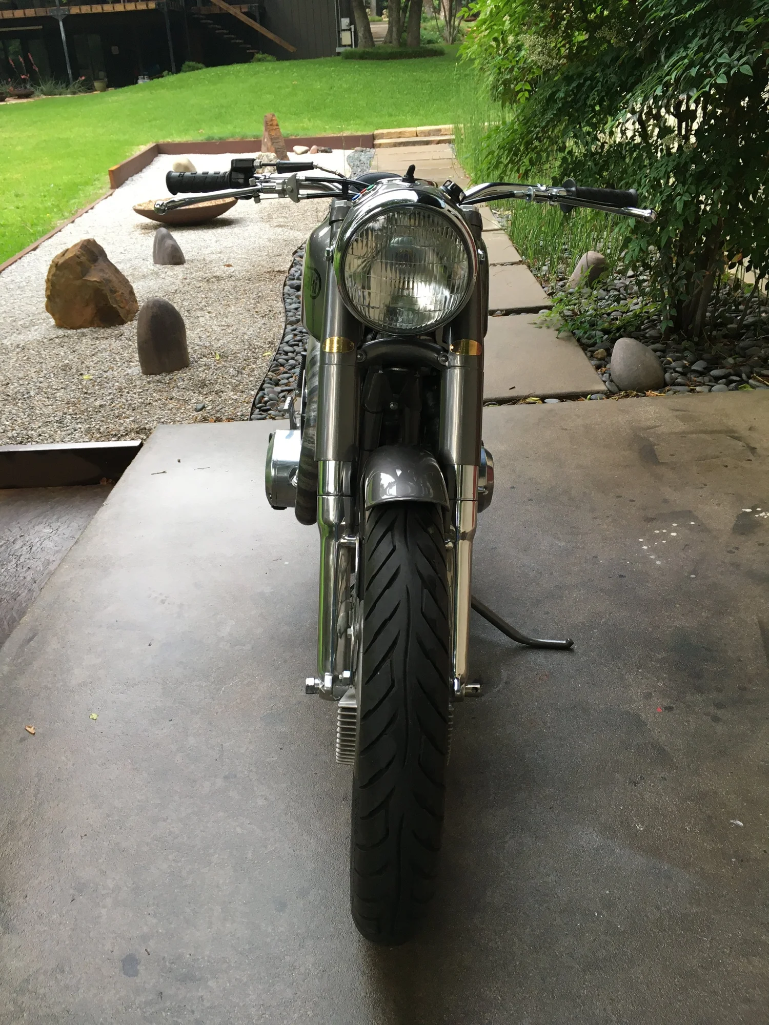 Finished off in classic Norton gray and Napa leather, despite the crazy combination of frame and motor, a sense of elegance was still strived for in the custom build. The rear wheel hub and brake are from a Vincent Black Lightning, a super rare bike