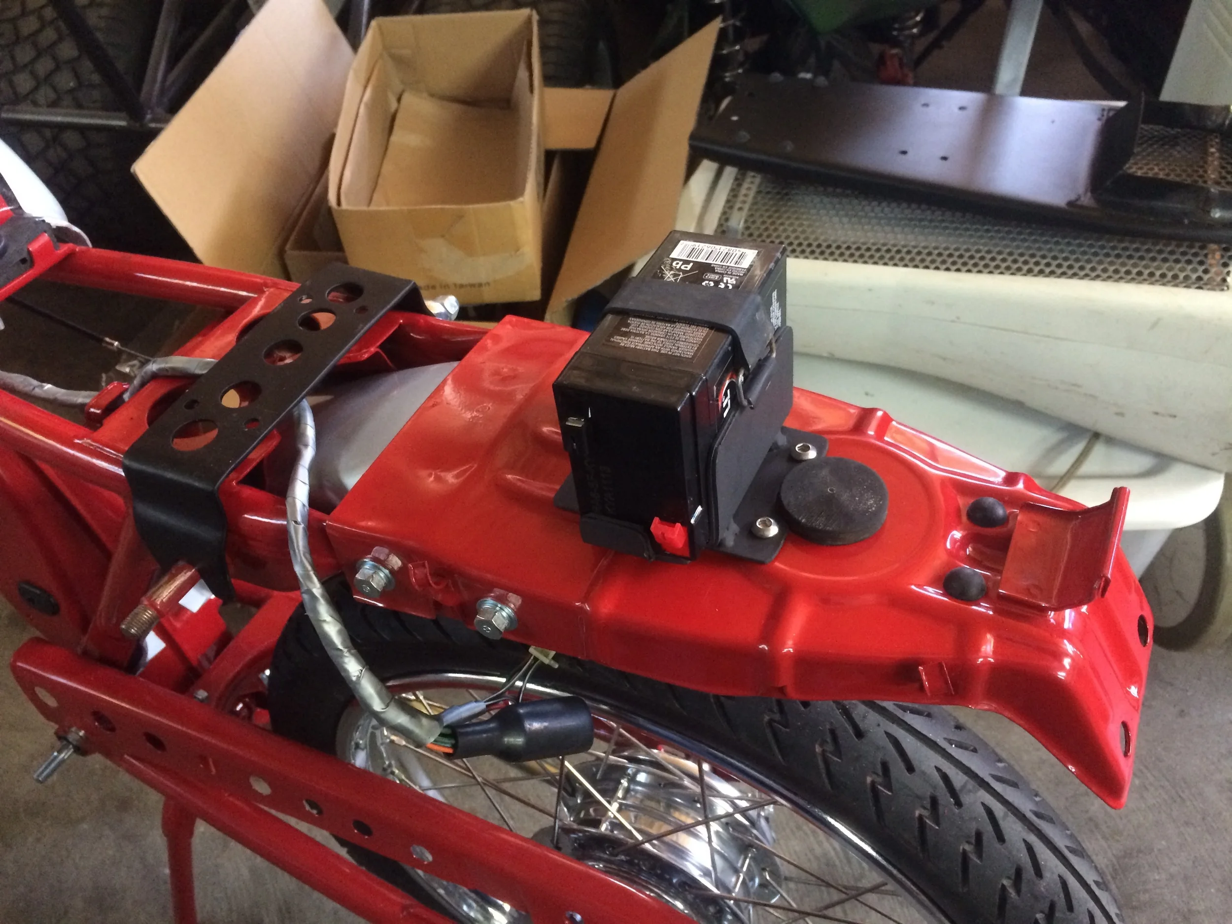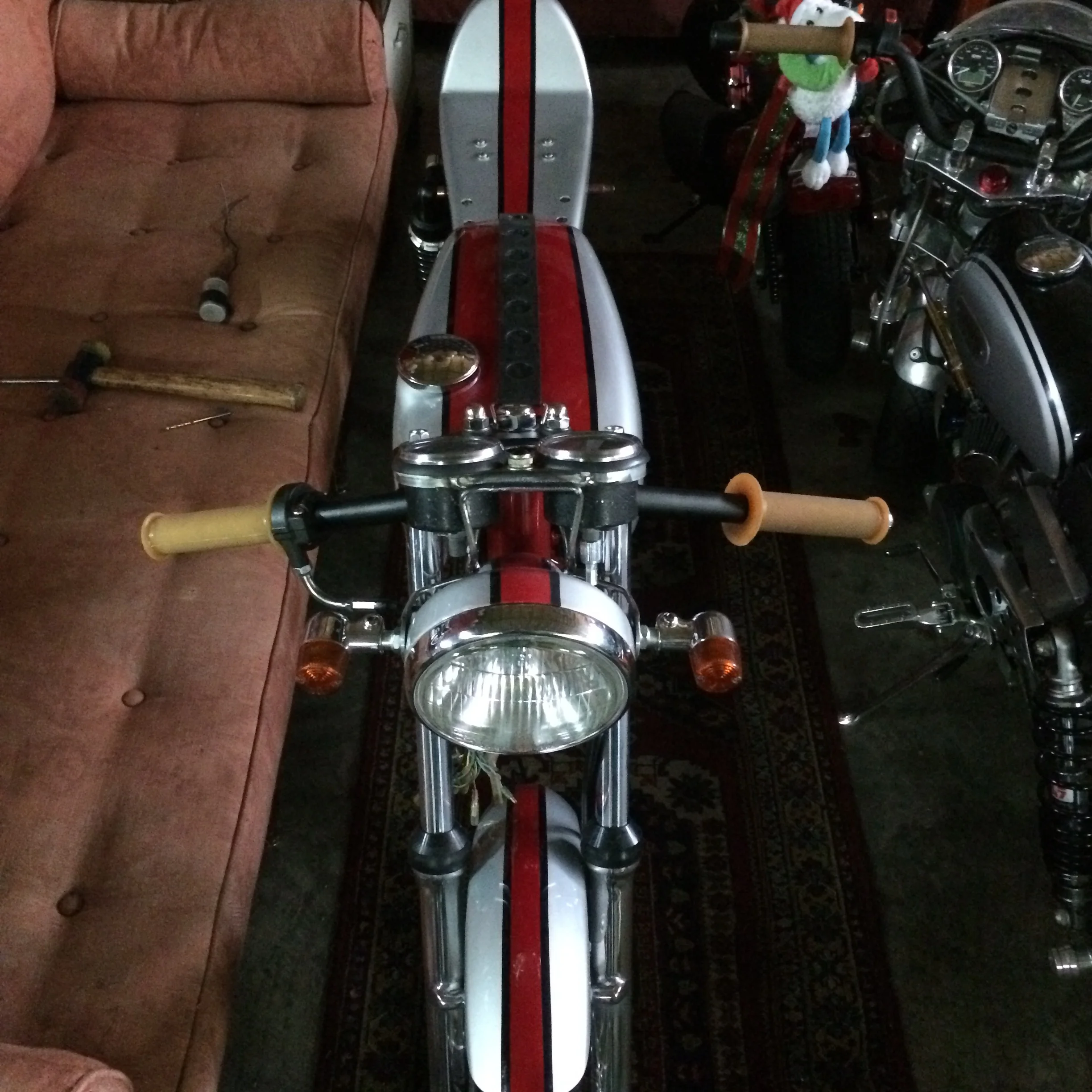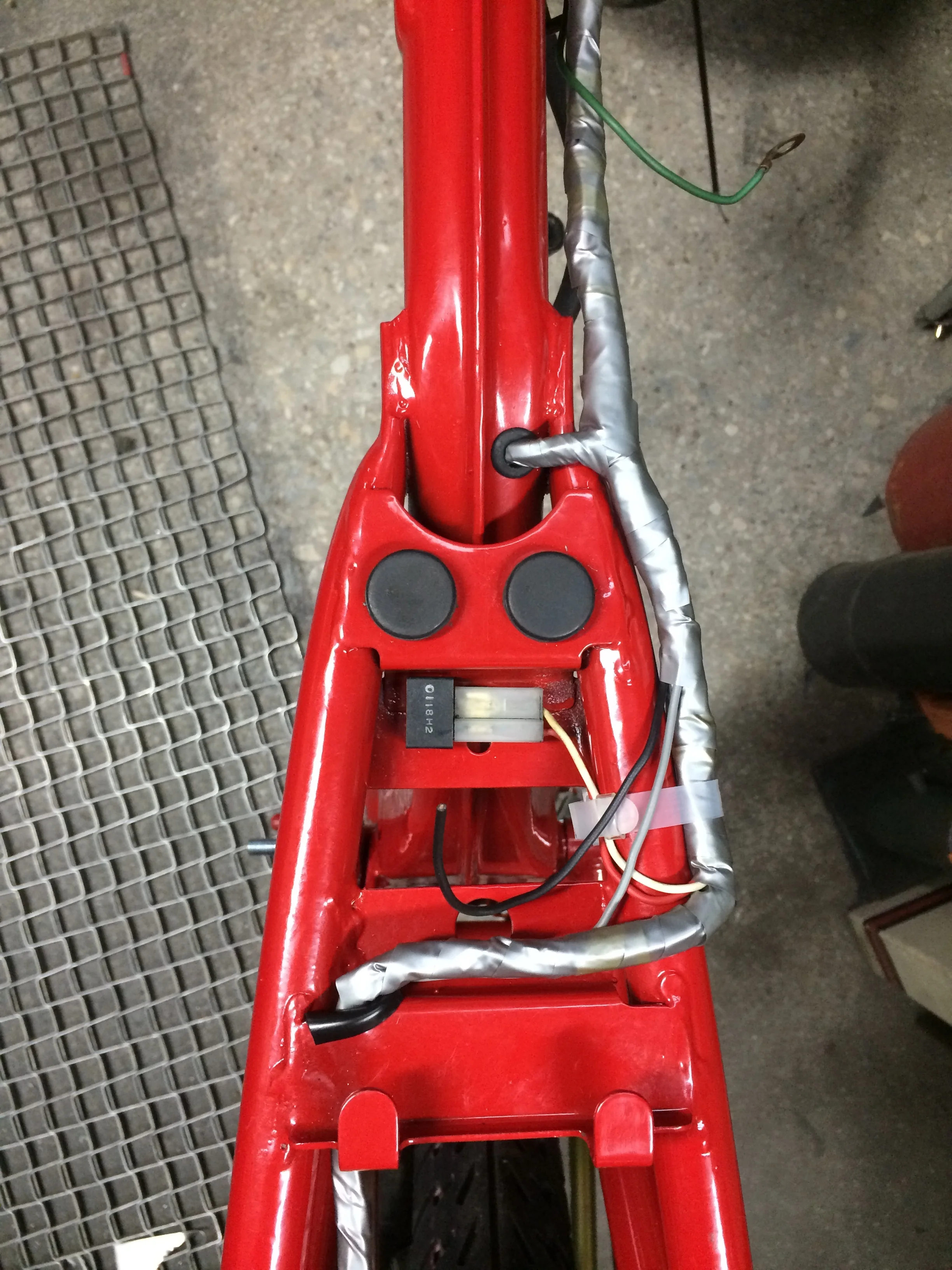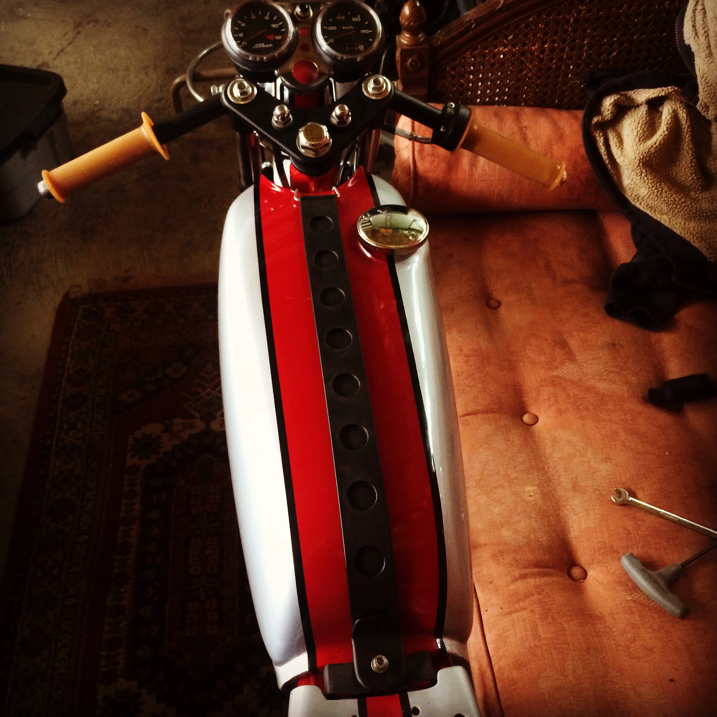 The paint is buffed out. Small jobs are getting done while some engine parts are on the way from Japan. The instrument cluster, rear shock springs, front brake caliper, and master cylinder are getting powdercoated. Built a battery box that fits under the rear hump. Reconfigured the wire harness to go with all the relocated components. There is a small grommet near the motor mount on the left side of the engine that will allow the wires to travel inside the main up-tube. The seat got some pads. Buffed out he badly oxidized front blinkers and assembled them back with freshly replated zinc, and stainless steel hardware. The original frame sticker was reapplied. Badges in two different sizes were tried out on the side of the tank.