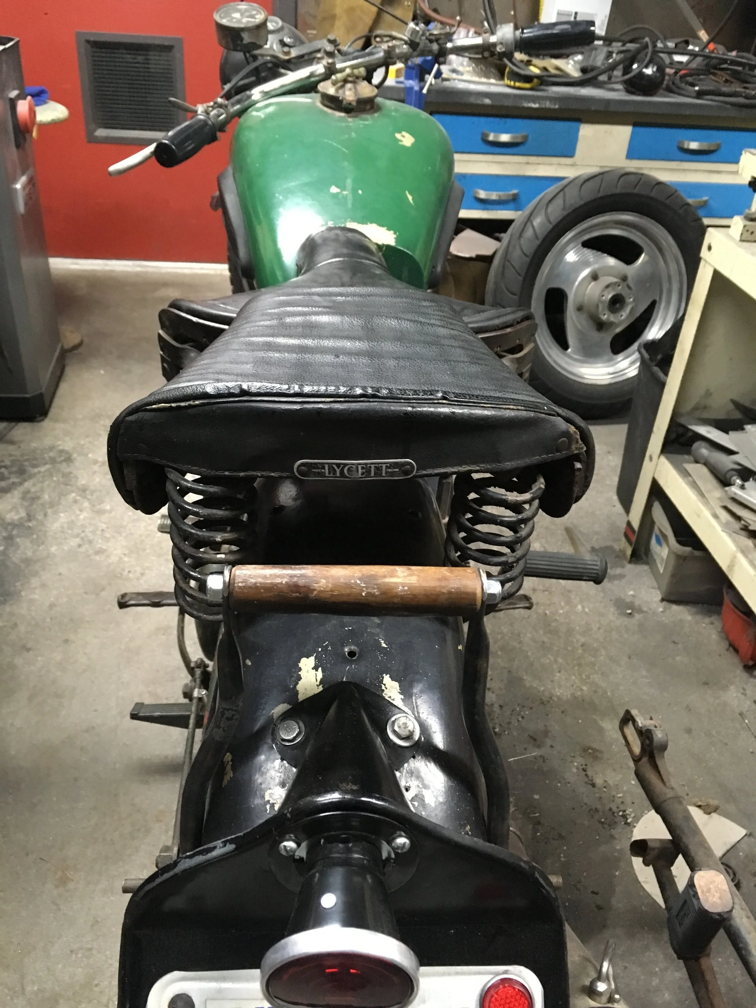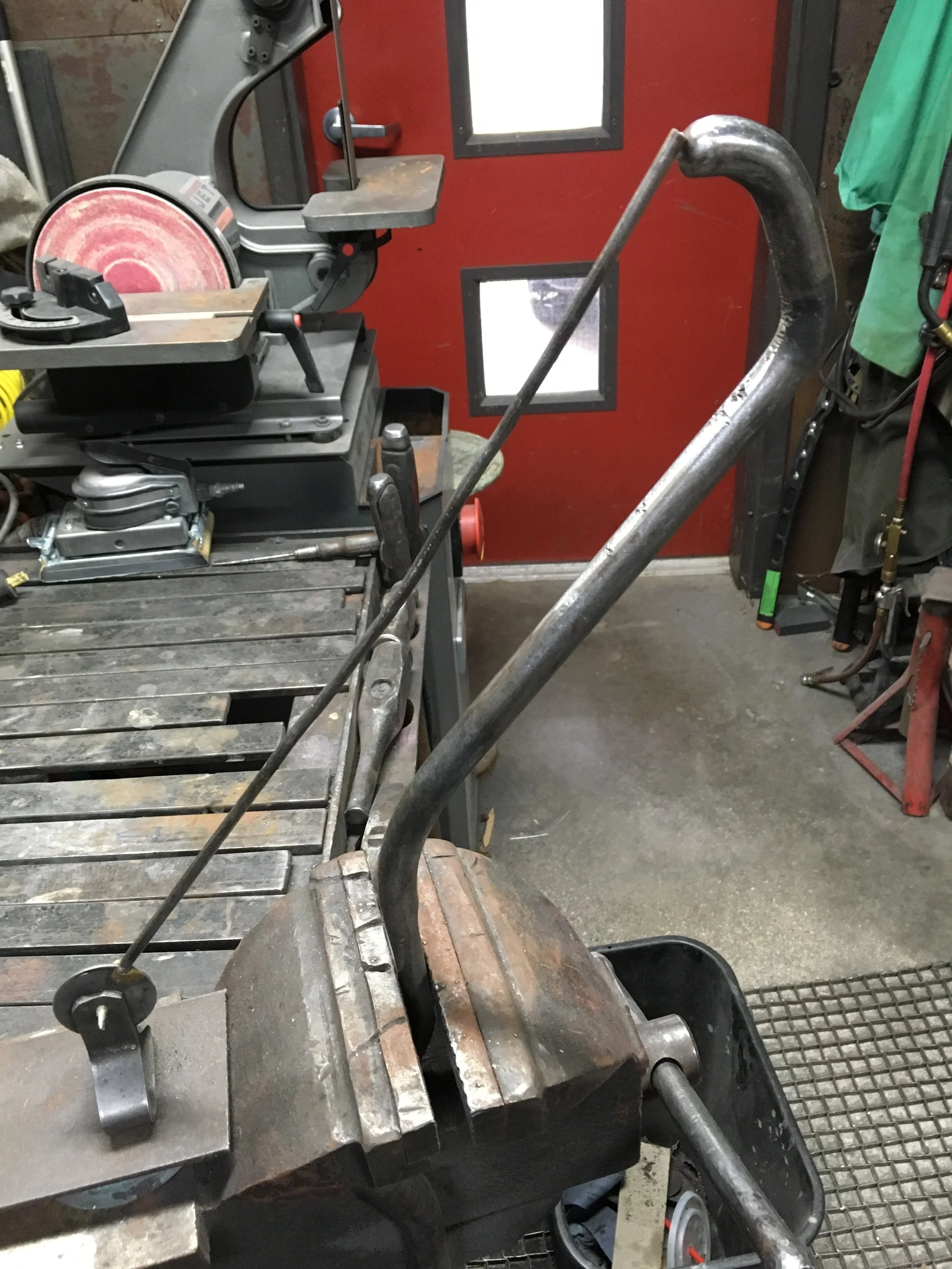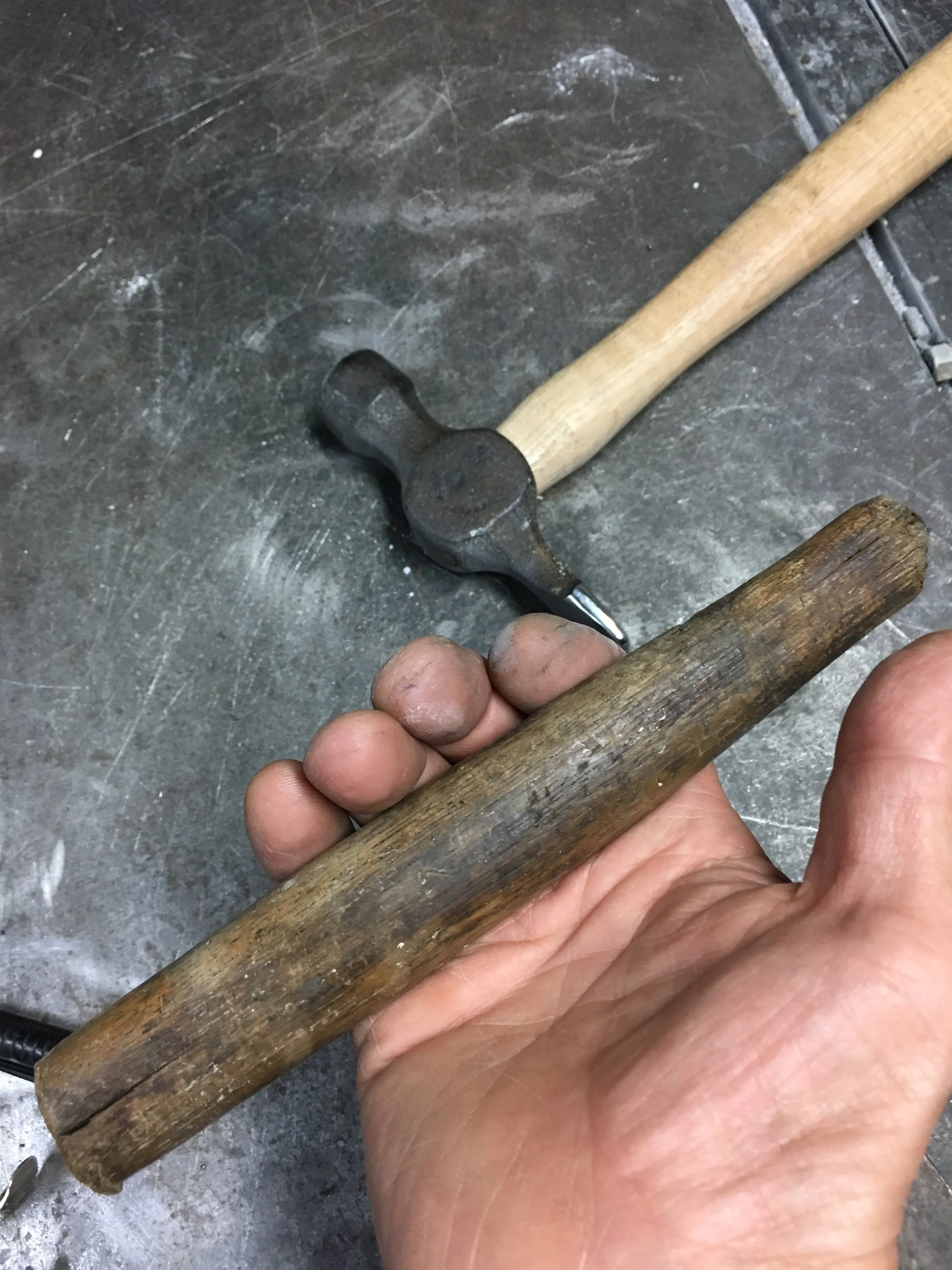 The hammer handle was used for a grab handle on the 1948 BSA WM20. Putting this bike on the rear wheel stand was awkward and required lifting the rear of the bike by the fender. Hickory is an extremely strong and durable wood, and the patina from years of use fits with the appearance of the bike. The vertical steel parts of the handle were formed from 3/8” tube.