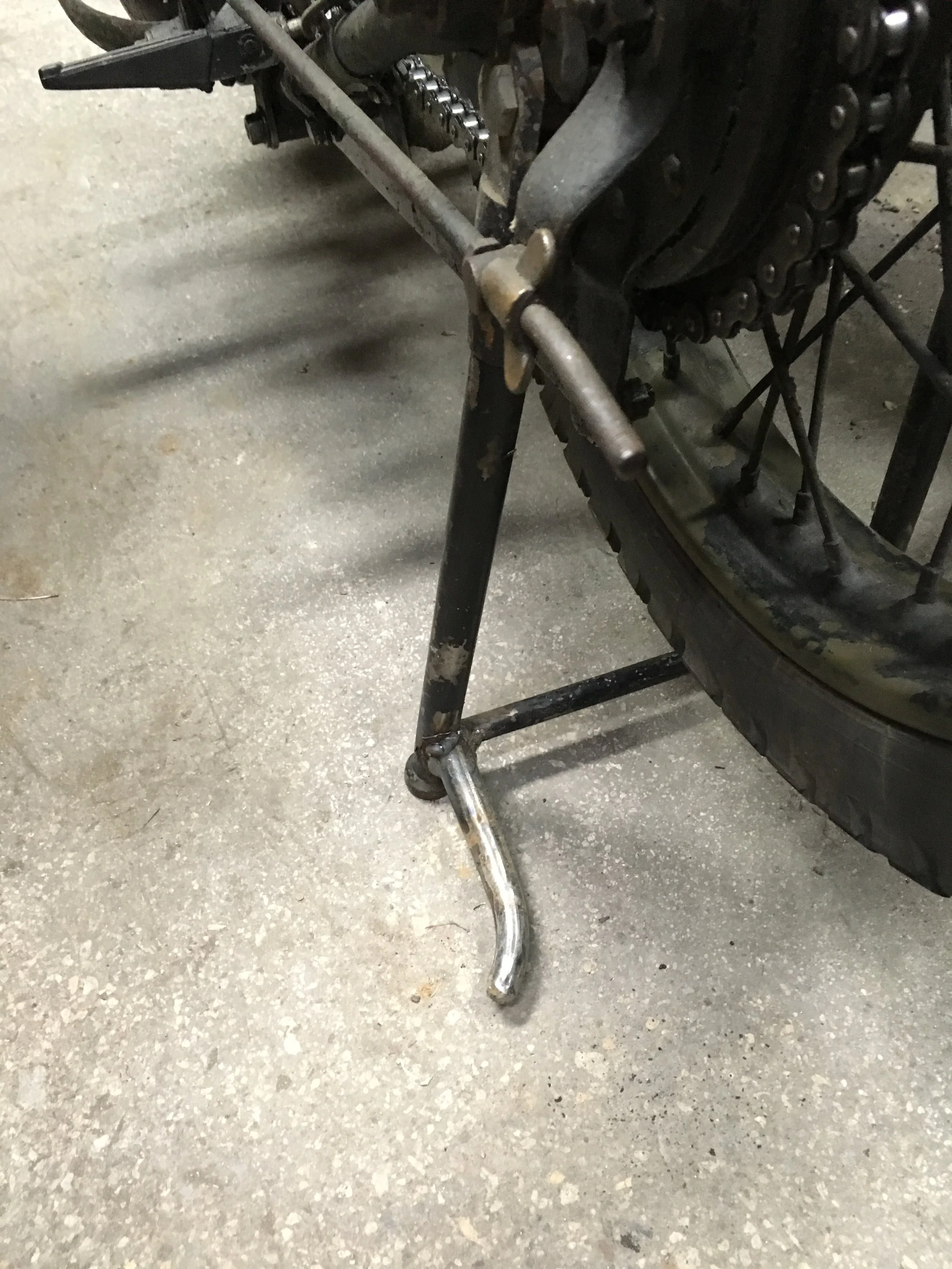 The Z50 brake pedal was used to make a rear stand foot lever. Hollow, tapered, curved pieces of metal are not easy to come up with, and the pedal middle section made for the perfect solution. The end was welded up to form a rounded tip. The combo of the grab bar and foot lever allows you to put the bike on the stand using one foot and hand, with significantly less difficulty.