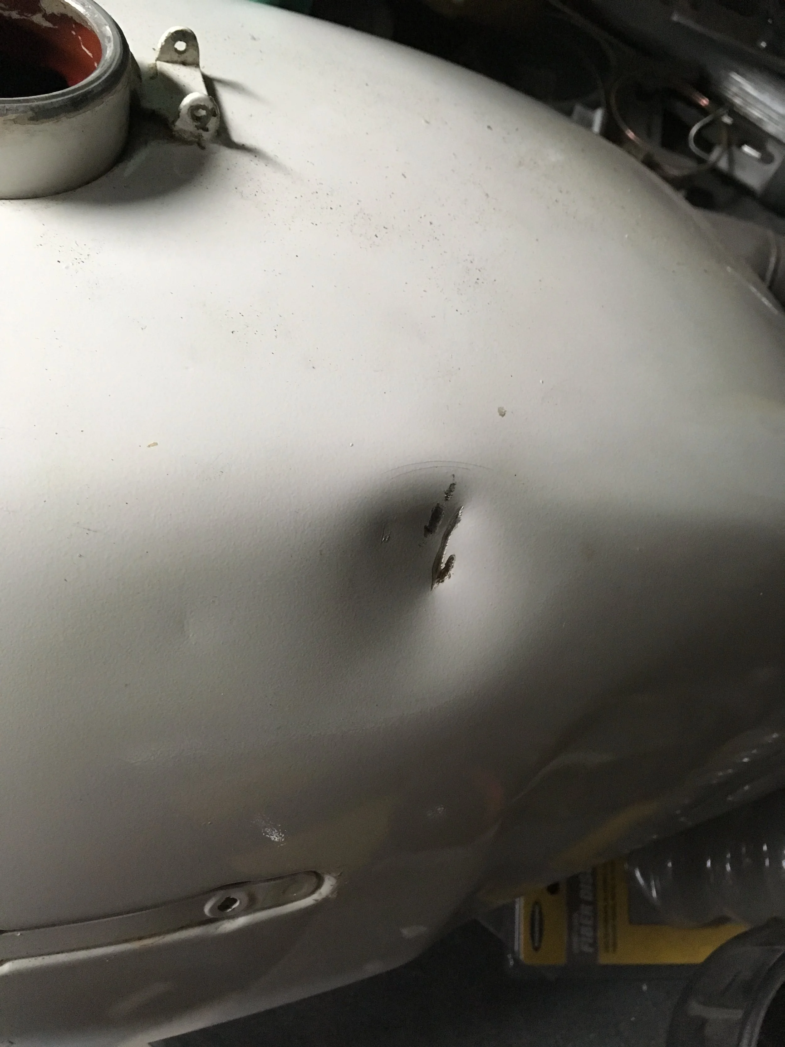 A device made to push dents out of the tank. The bent piece of rod fits inside the gas tank filler hole, and the tip is placed on the back of the dent. The thin piece of rod touching it is used to determine exactly where the tip is once it is inside the tank. Once the tip is in place, the tank is pulled using finger pressure near the dent, where you can feel the progress.