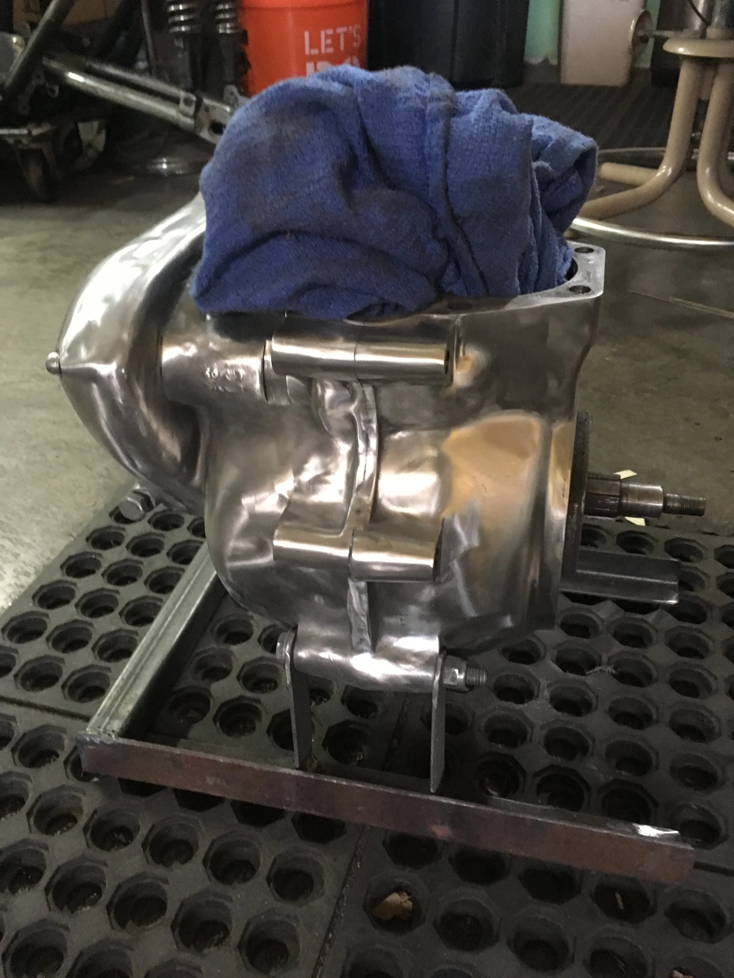 There are two covers on the tranny, stacked on each other. I wish there were some before pics of this. The lines between the cases are almost invisible. The casting lines and rough texture will also be polished out. The reason this was done at this stage was to get the parts needing chrome and cadmium plating off the tranny and engine.