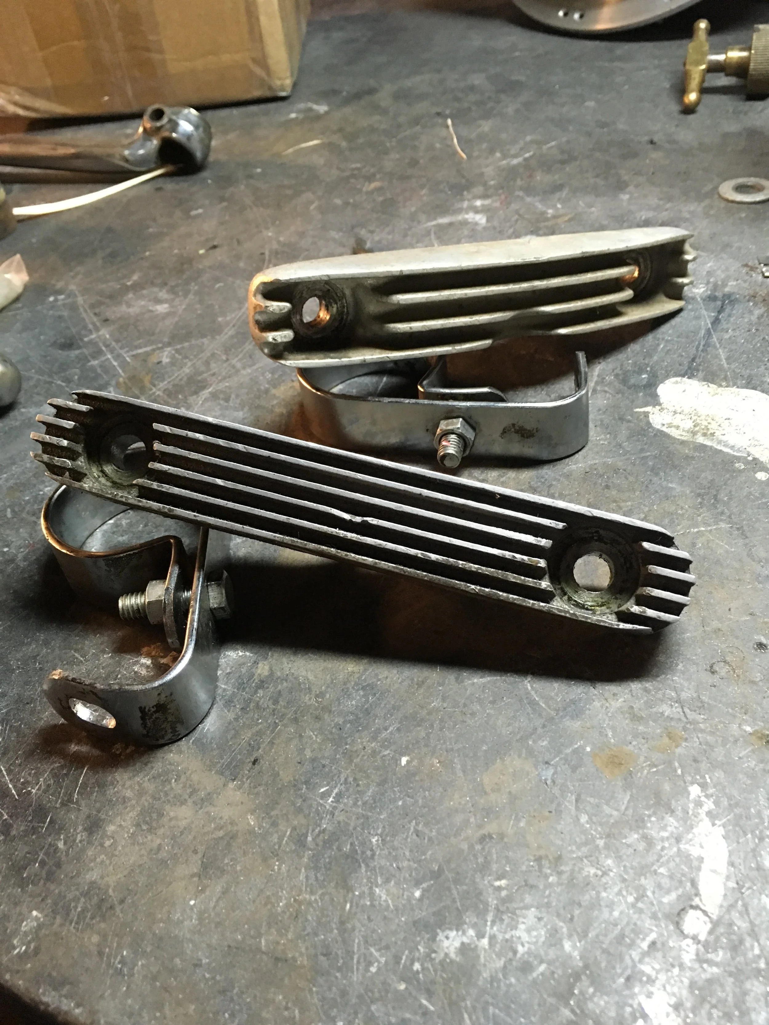Still getting the chrome parts prepped prior to plating. Sometimes you get a pleasant surprise. The original plating was flaking off, revealing a brass fixture and some copper plating left from the plating process. With all the brass going on this bike, it will be left as-is.