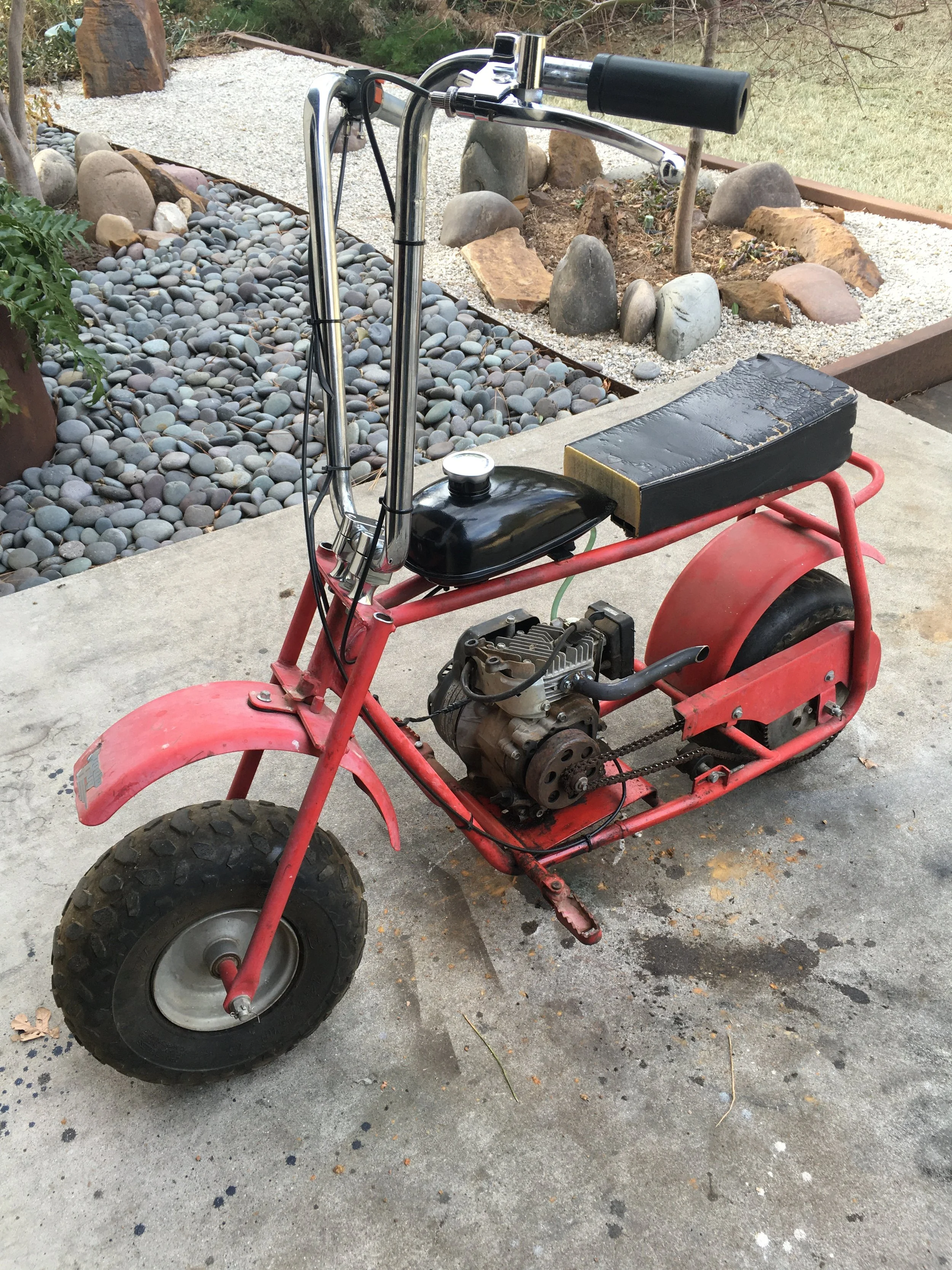 An finally… This DoodleBug minibike came from the same family as the 1967 Triumph Mountain Cub. It was hanging around the shop over at Skratch’s Garage in Haltom City, Texas, and I took it to do some mods and maintenance. It is being given a little refresh, with new bars, a mini Whizzer style tank, straight exhaust pipe, tires, chain, cables, and hand controls. She is a runner and rider, with a pretty mild engine. There may be an engine upgrade in the future…