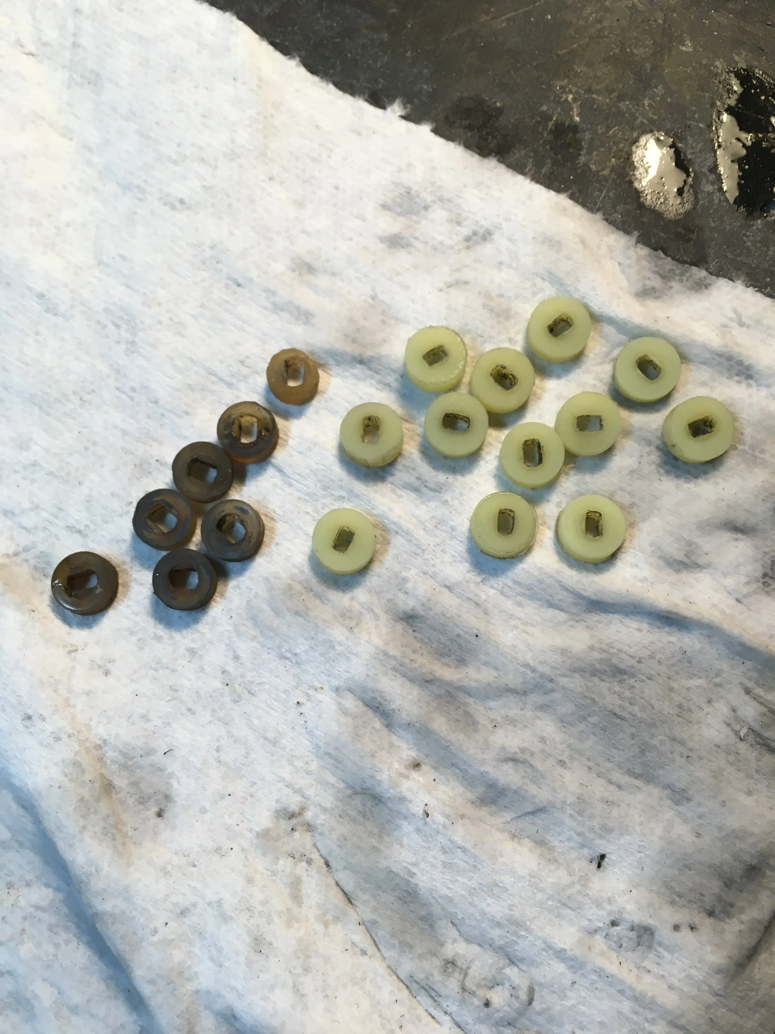 The original plastic sealing washer on the choke lever is one of the impossible parts to find. Pictures of the part online look like it is made of natural nylon. The used washers, seen on the left, are somewhat puckered on the edges, suggesting they have shrunk after all the years, heat, and fuel. A piece of nylon rod was turned down on a lathe to a size slightly larger than the largest original one I could find (there were a total of ten measured to get the size.) Individual plugs were cut from that rod, with a 7/64” hole drilled in the center.