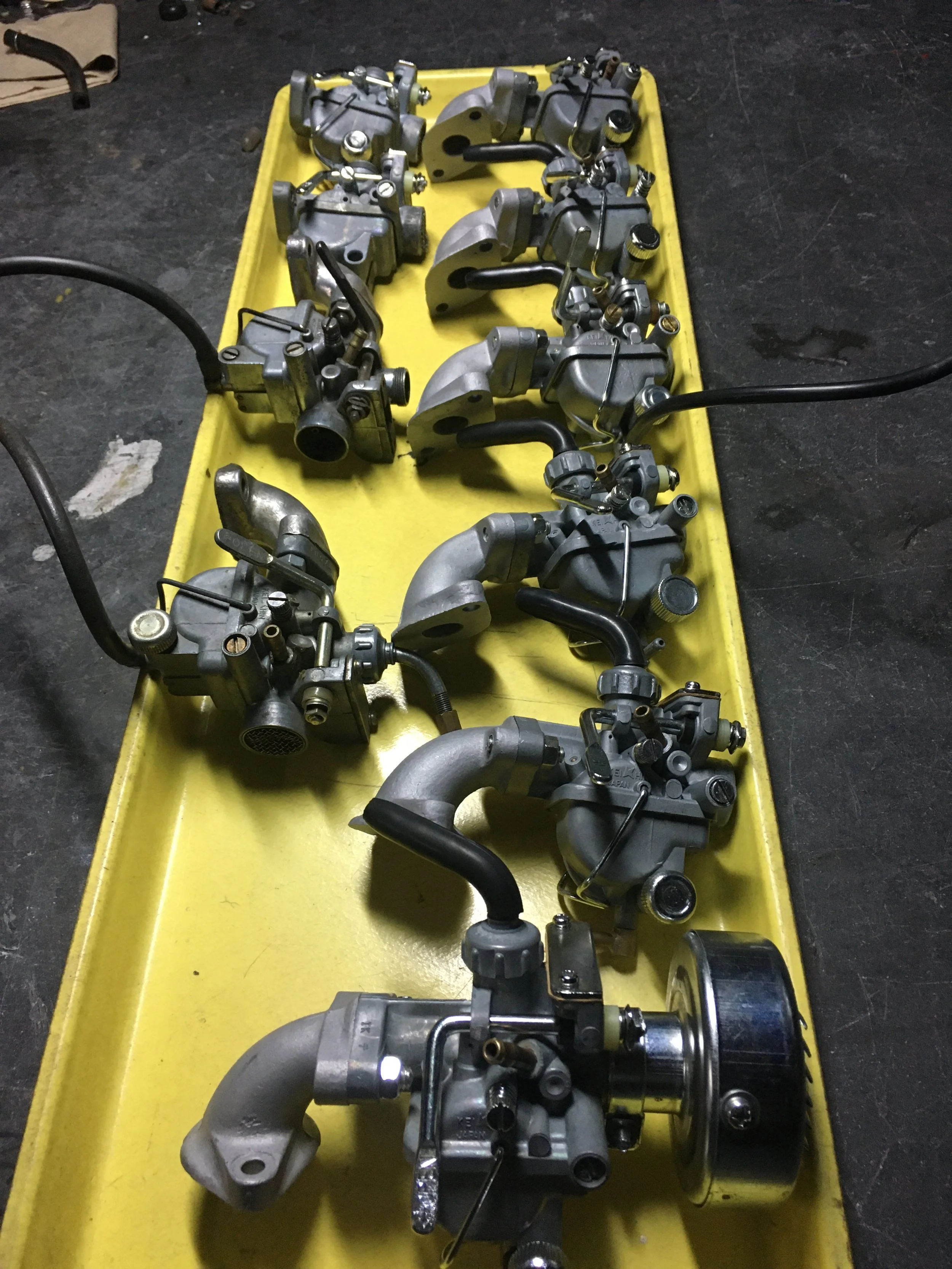 Two Honda 1970 Z50 minibikes were in need of a carburetor. With as many minis as there are around here, it pays to have one ready. Eight original carbs were worked over, with six of them completed, and a couple still needing parts.