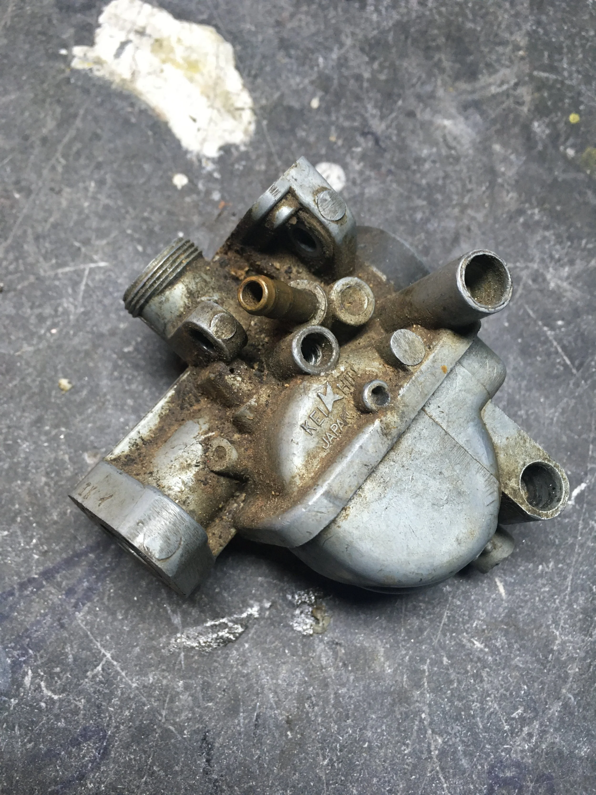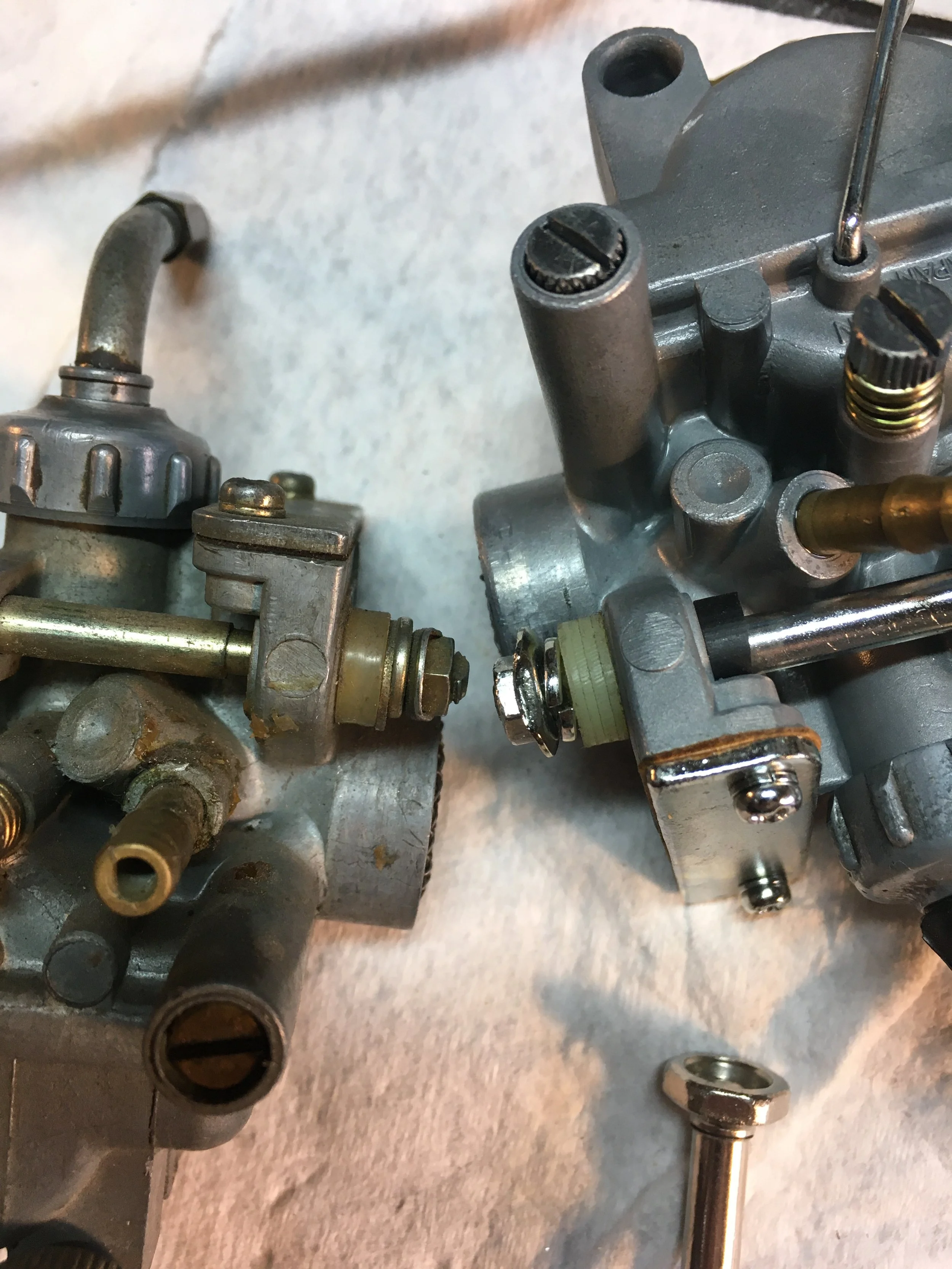 This is a typical before picture. The choke assembly and any other steel parts have been stripped from the carb and sent out for zinc plating. The carb body is cleaned in an ultrasonic cleaner, with hot degreaser. Everything gets blown out, and put back together with new seals and gaskets. Some of these carbs were incomplete, missing floats, slides and fuel hose spigots. Replacements will be found, or they will stay as parts carbs.