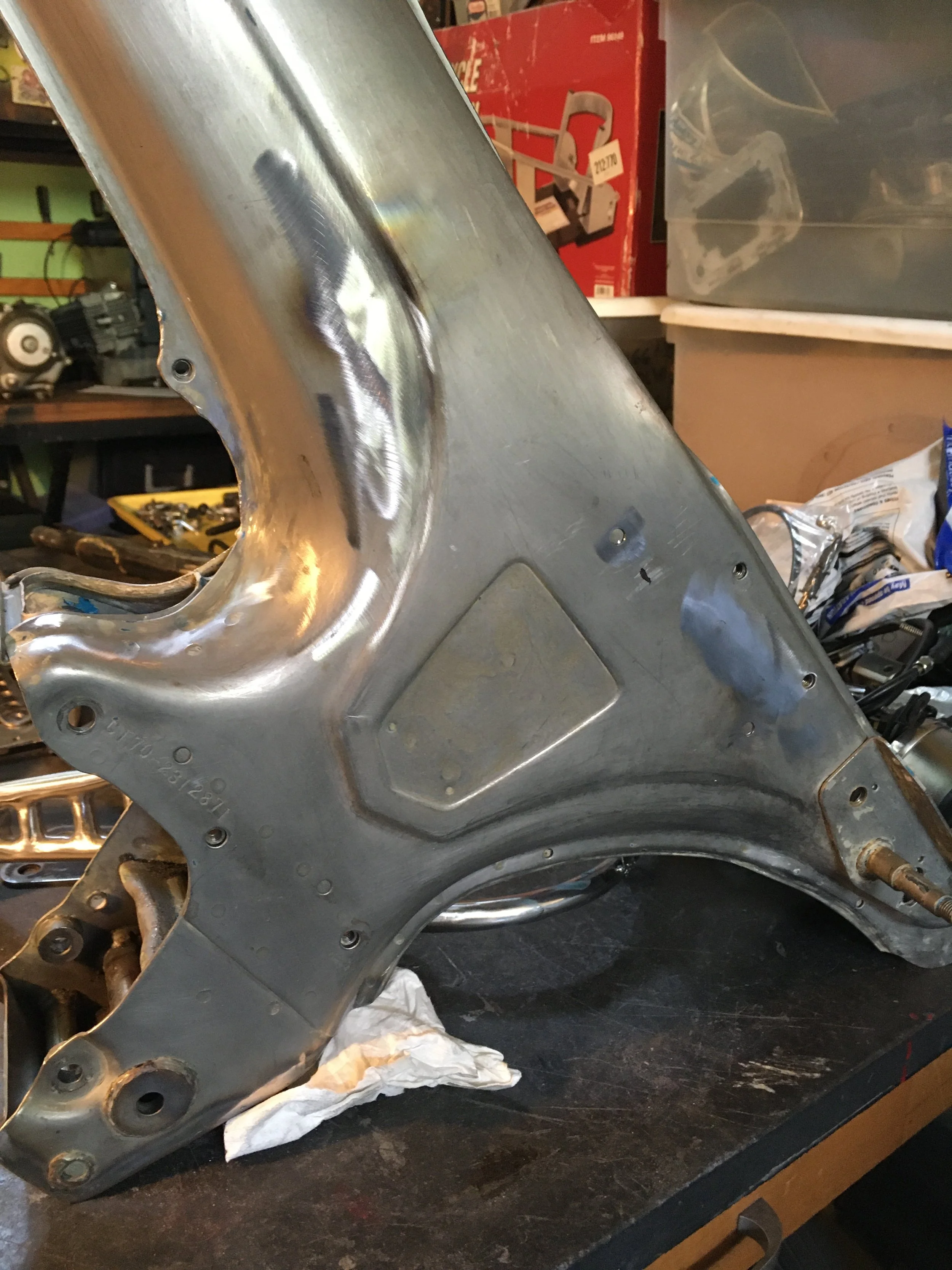 With a new custom plate welded in, this, along with the spacer, will strengthen the lower body in the critical motor mount/swingarm pivot area. The boxing plate is similar to the Honda ST90, which has a very similar frame, with the external swingarm pivot. The rear frame channel looks better with the fender mounts stripped out.