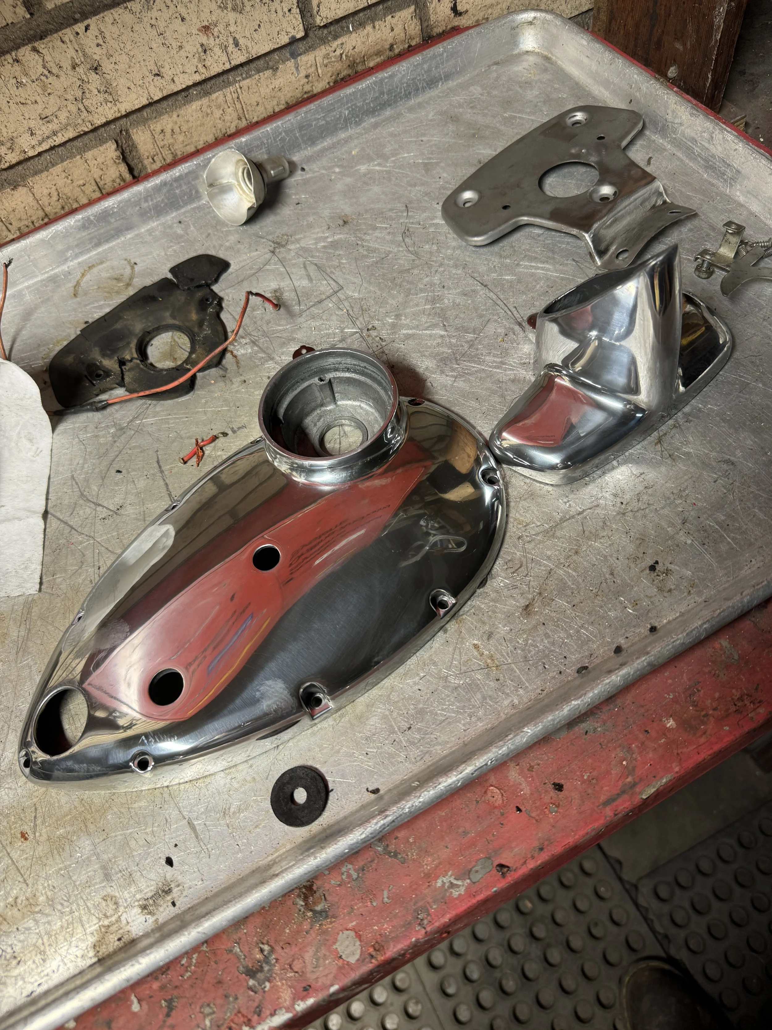 The primary cover was said to be NOS when purchased online, but it had a dent in need of some persuasion. The dent was carefully tapped out, followed by a good polishing.