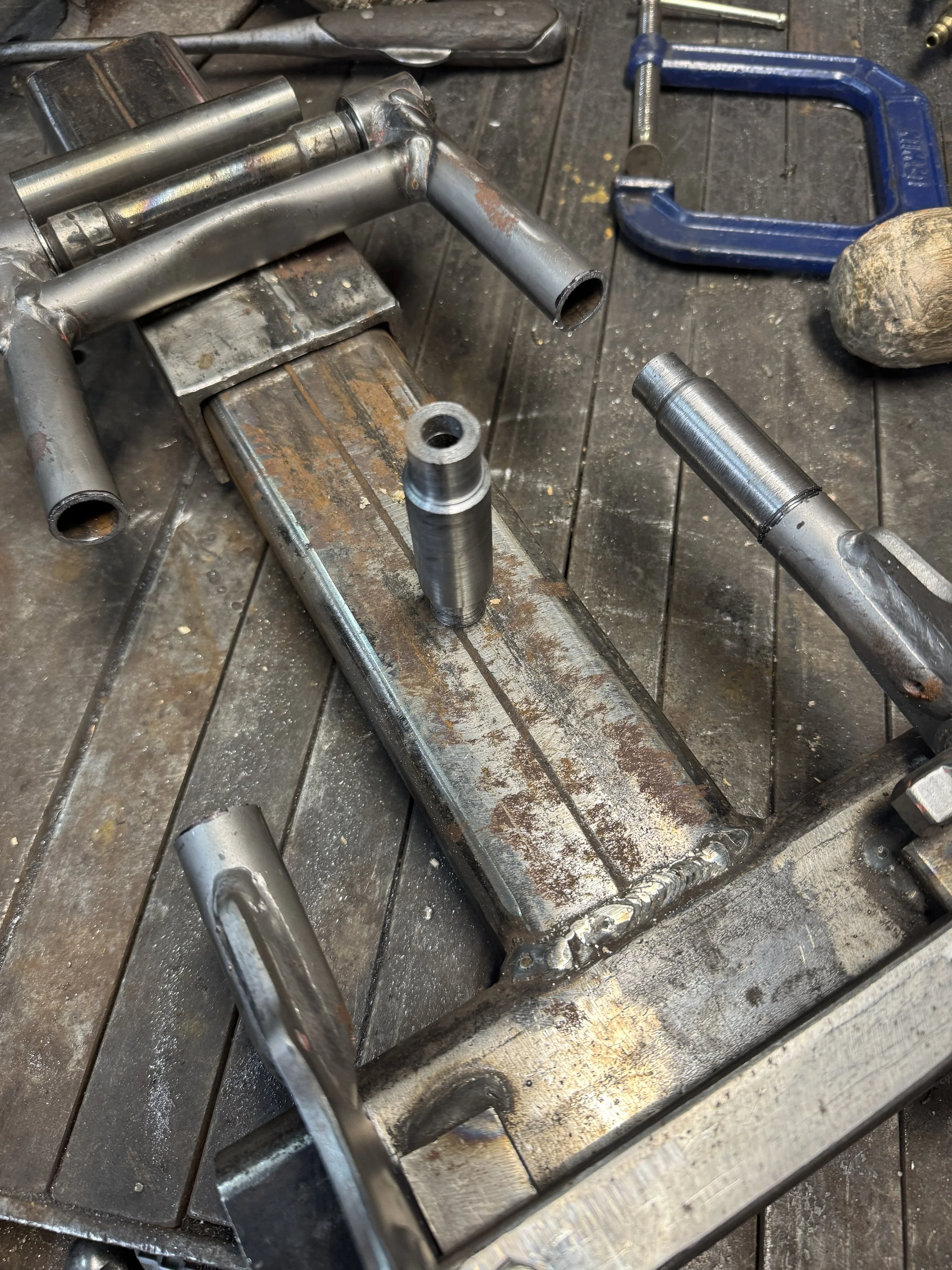 A stock swingarm was lengthened 55mm using a custom jig. .250” wall DOM steel tubing was used to make the extension slugs.