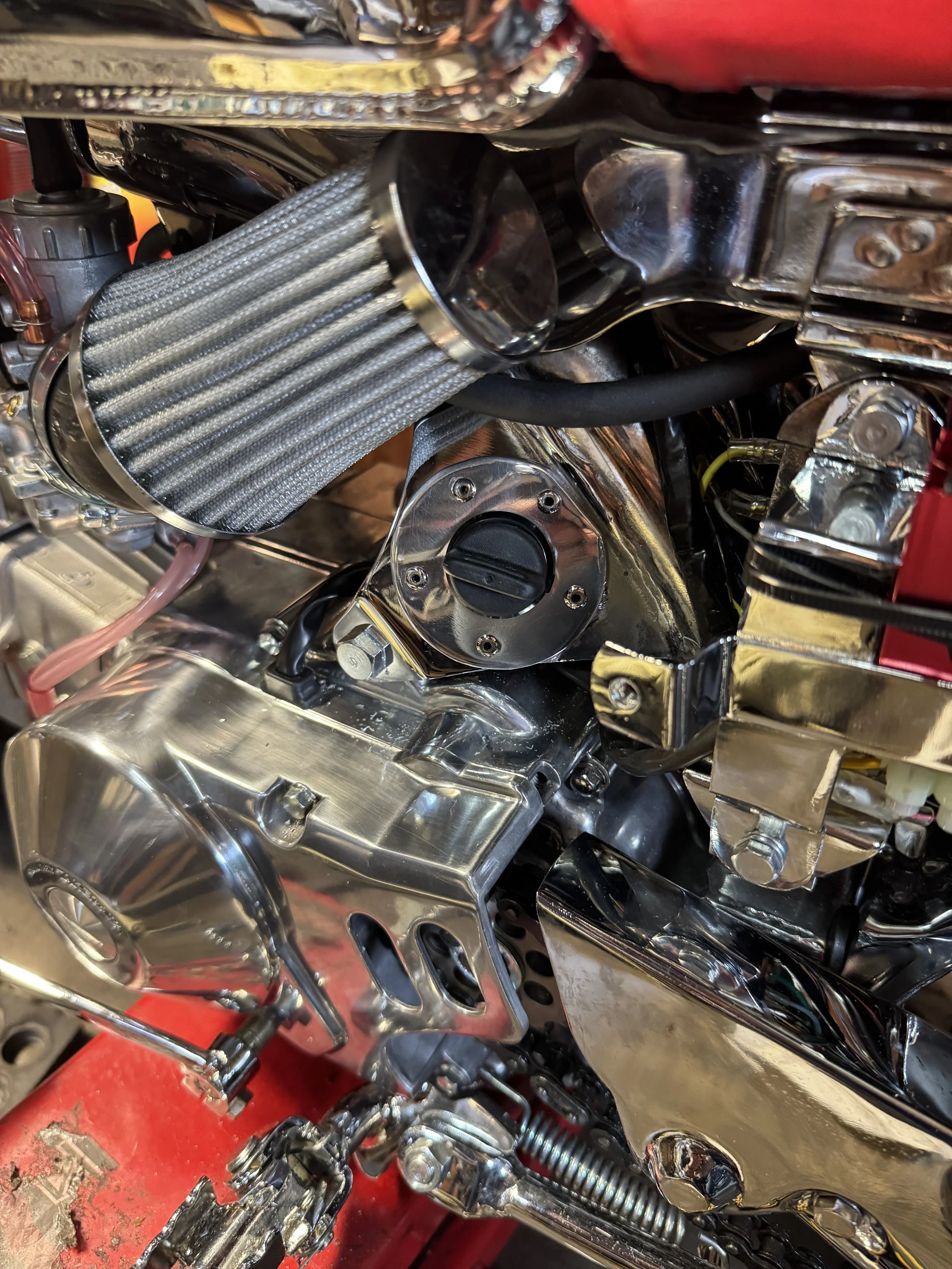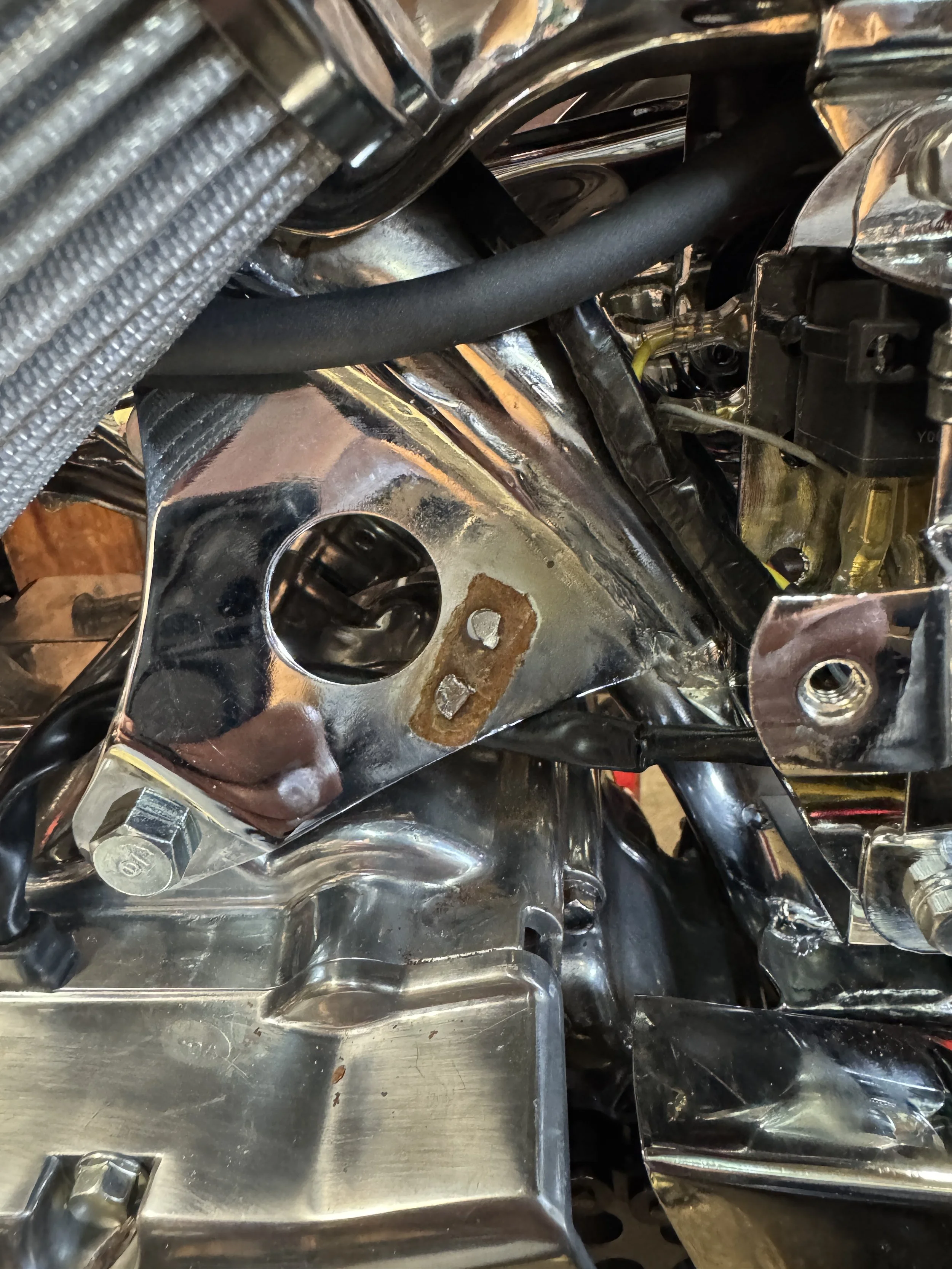 One of the reasons the particular key switch was used was because it fits into the hole in the left engine mount. Although it clicks into the hole, it pops out easily, and spins freely. In past builds, I have welded a plate to the inside of the engine mount that has the right thickness and cut-outs to lock it in tight. The frame hole would then be drilled out to allow the switch to sit recessed within the hole. This pushed the switch a little further back, but was otherwise a good mod. Since the frame had already been chrome plated, welding on the bracket would present some problems. A second problem was the factory clip for the ignition pigtail, adjacent to the hole. It had been badly damaged during the plating process, and was not being used. The rusty spot in the picture is where it once was, with a couple spot welds still visible.