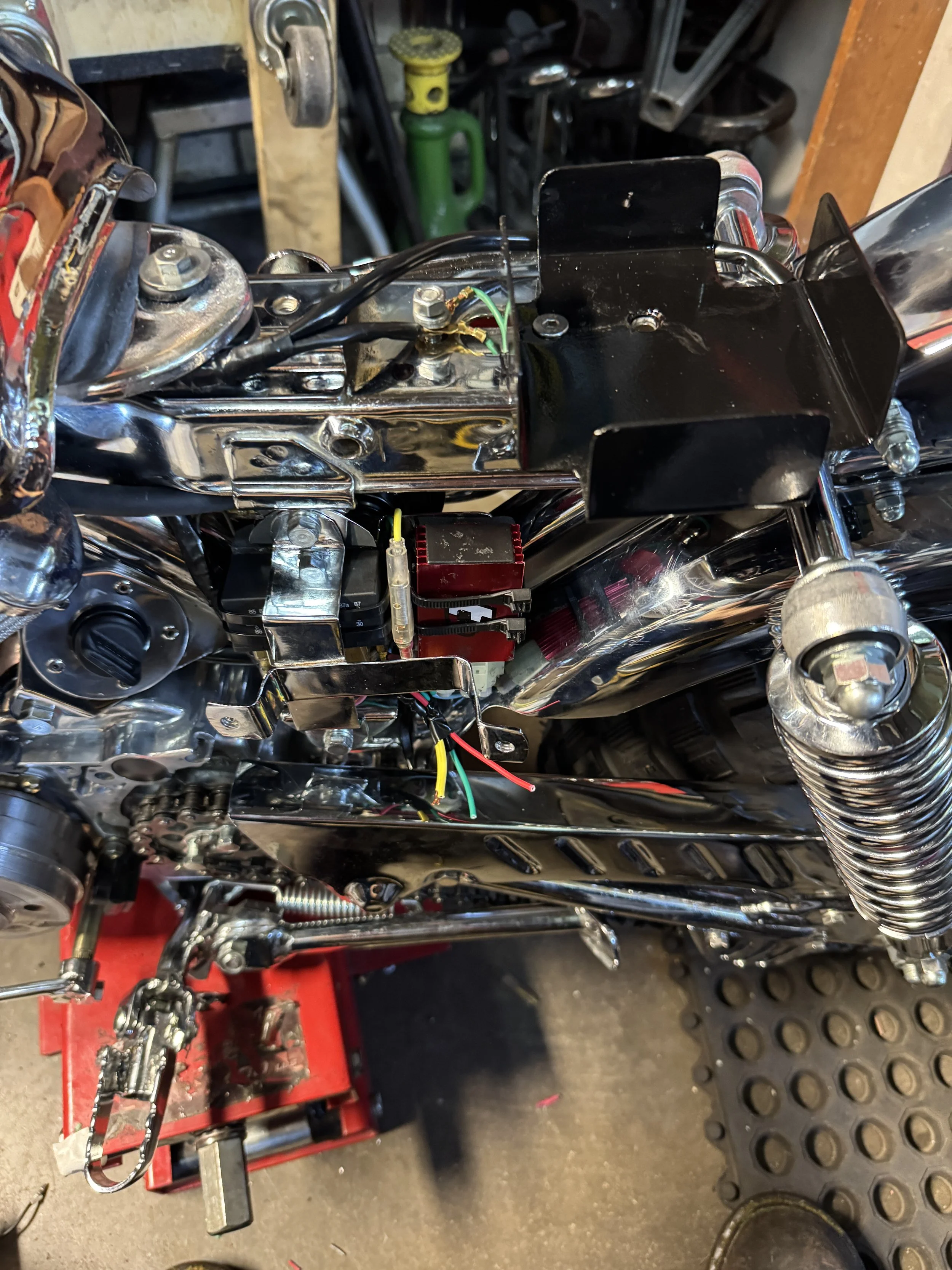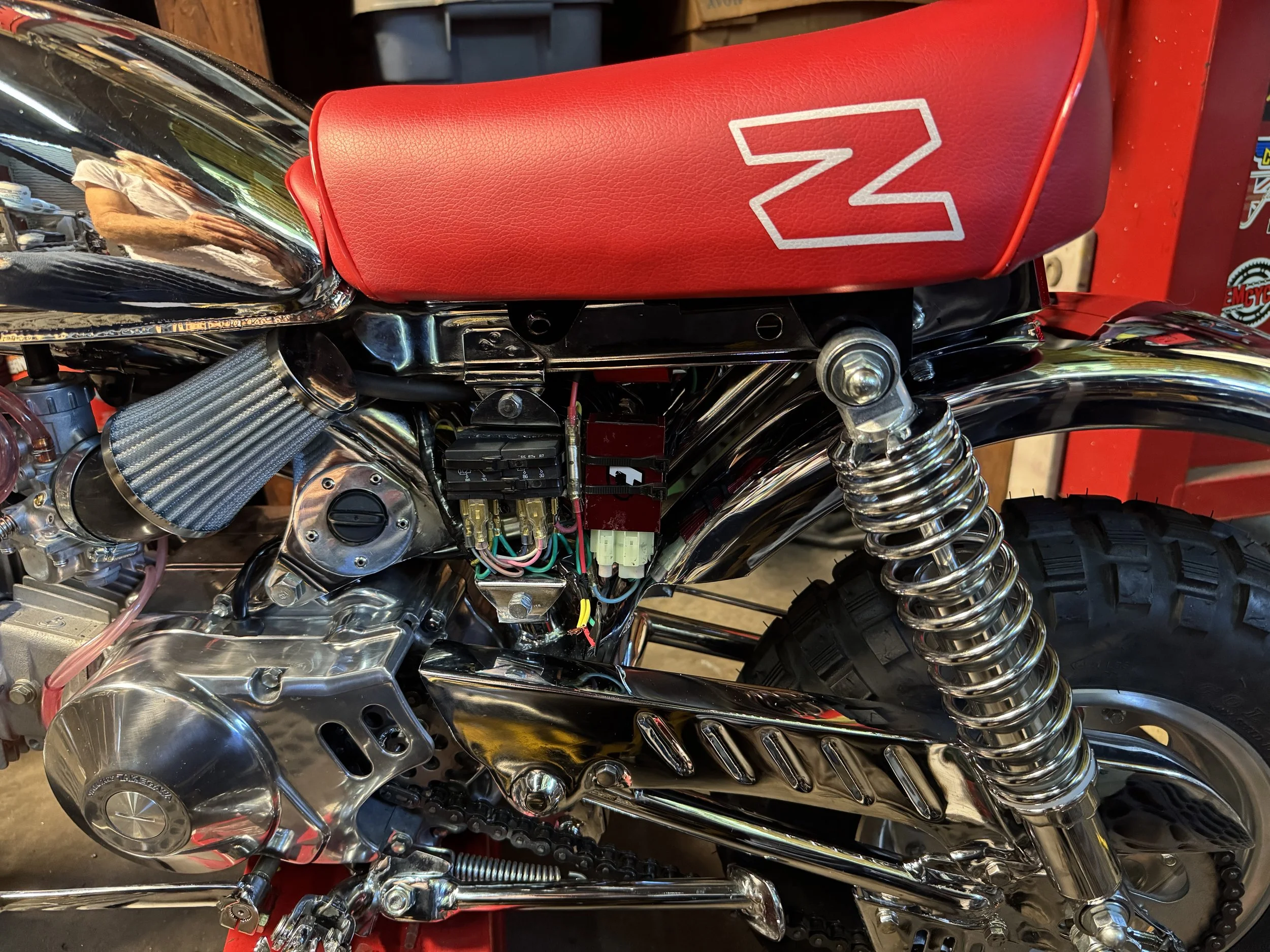 Lighting on a minibike is usually pretty basic, and often absent. On the latest build, the 1980 Honda Chrome Custom, a simple battery-less pit bike design was initially used to get things going, but without a battery, things like horns and relays were not functioning well, if at all, and there was no capacity to add things like instruments and ground effects (for Parade of Lights Elvi rides.) Adding a battery was challenging because of space issues. The decision was made to change out the stator for a ground lifted, or floating stator and a full wave rectifier to change the system. Other considerations were that a key switch was now needed, and along with the handlebar buttons, used smaller gauge wire unsuitable to carry the electrical load. The relays were added to turn the lights on and switch to brights.