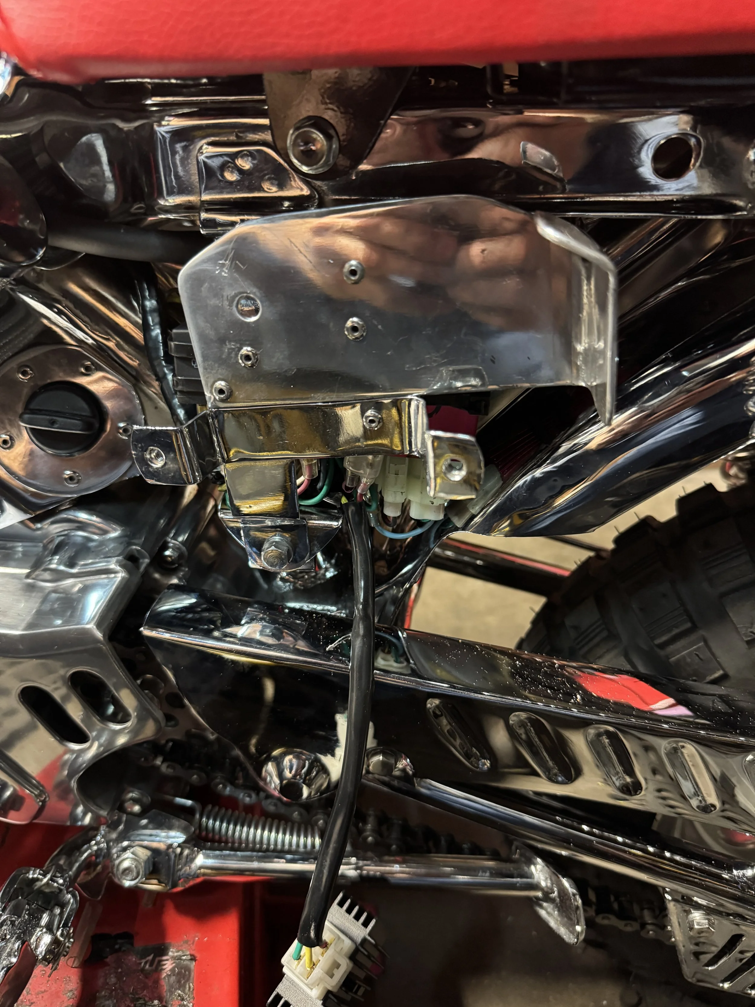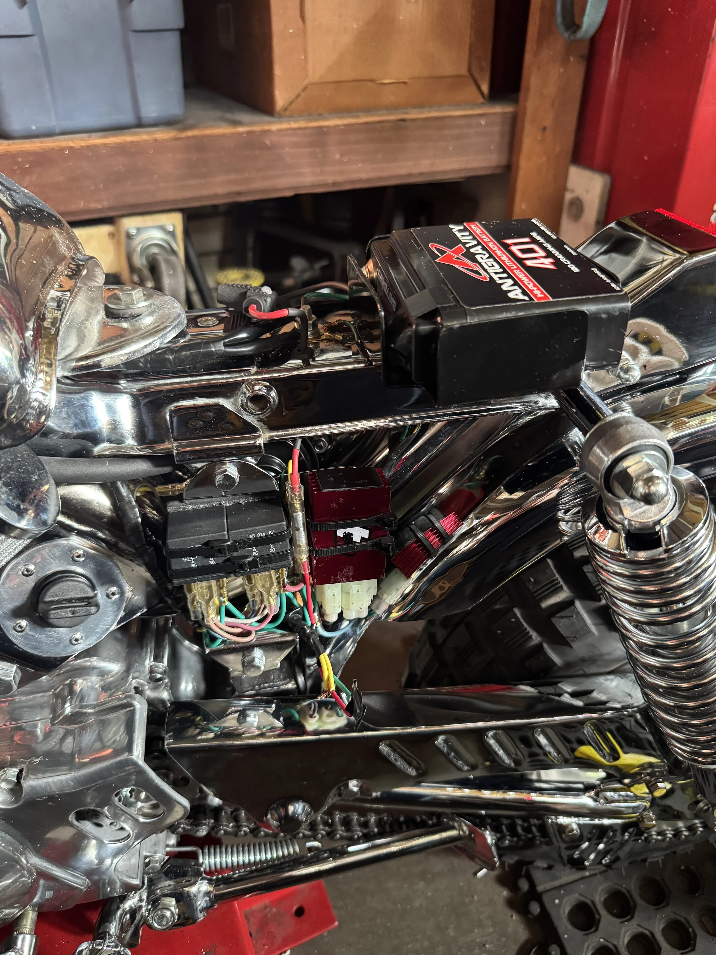 At this point, the tray is in place, and the only remaining wiring is to hook up a full-wave rectifier. The plate made to mount the CDI box and relays conceals a horn, mounted on the backside of the plate.