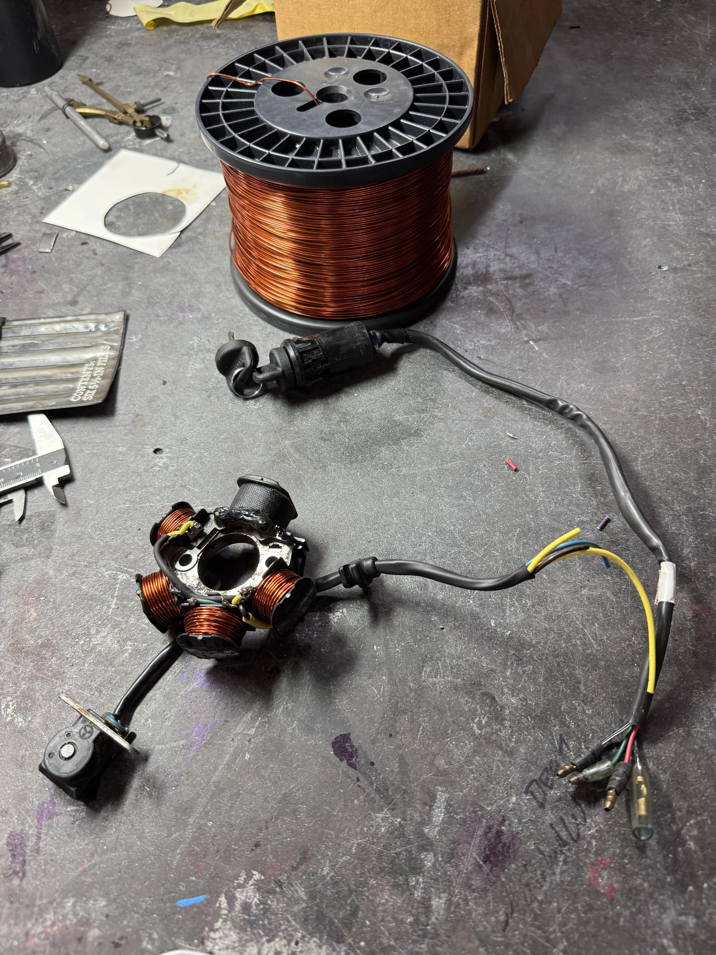 The original stator was wrapped with magnet wire and the output was changed to a two-wire “floating stator” type. It would have been faster changing the output of the Ricky stator to this configuration, but when experimenting with a new system, I like to leave the option to return back to original if the experiment is not successful. The 20 gauge OEM Honda key switch wires, laid next to the 18 gauge output wires of the stator are clearly smaller. The handlebar switches are rated for a headlight, but my experience with these unbranded aftermarket switches is that they produce heat, and sometimes fail because of it. With the small gauge key switch wiring and the handlebar switch issues, it was decided to use a relay system that passes current in a circuit parallel to the switched power key circuit.
