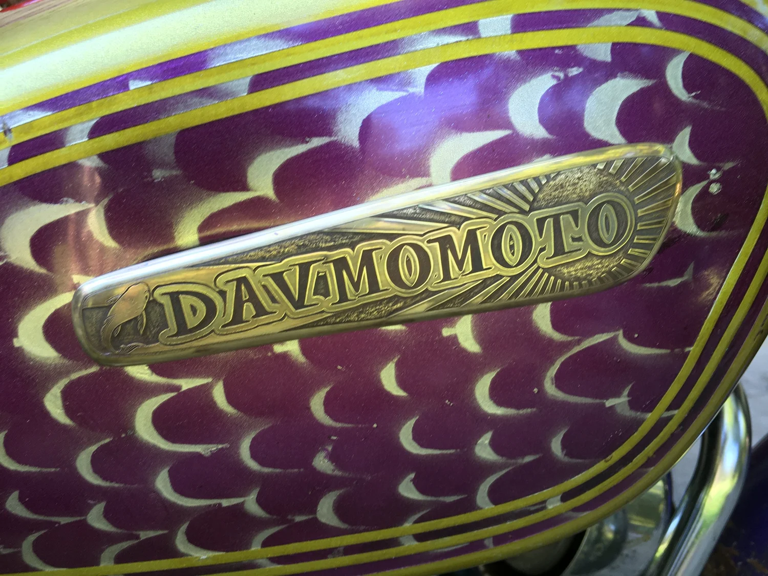 The amazing seat cover by Mobtown Mike of Weatherford, Texas in beautiful Zodiac flake makes the bike. The street tire in front and knobbies in back provide great street handling.  A knobby front tire is mounted and ready for off-road riding, which