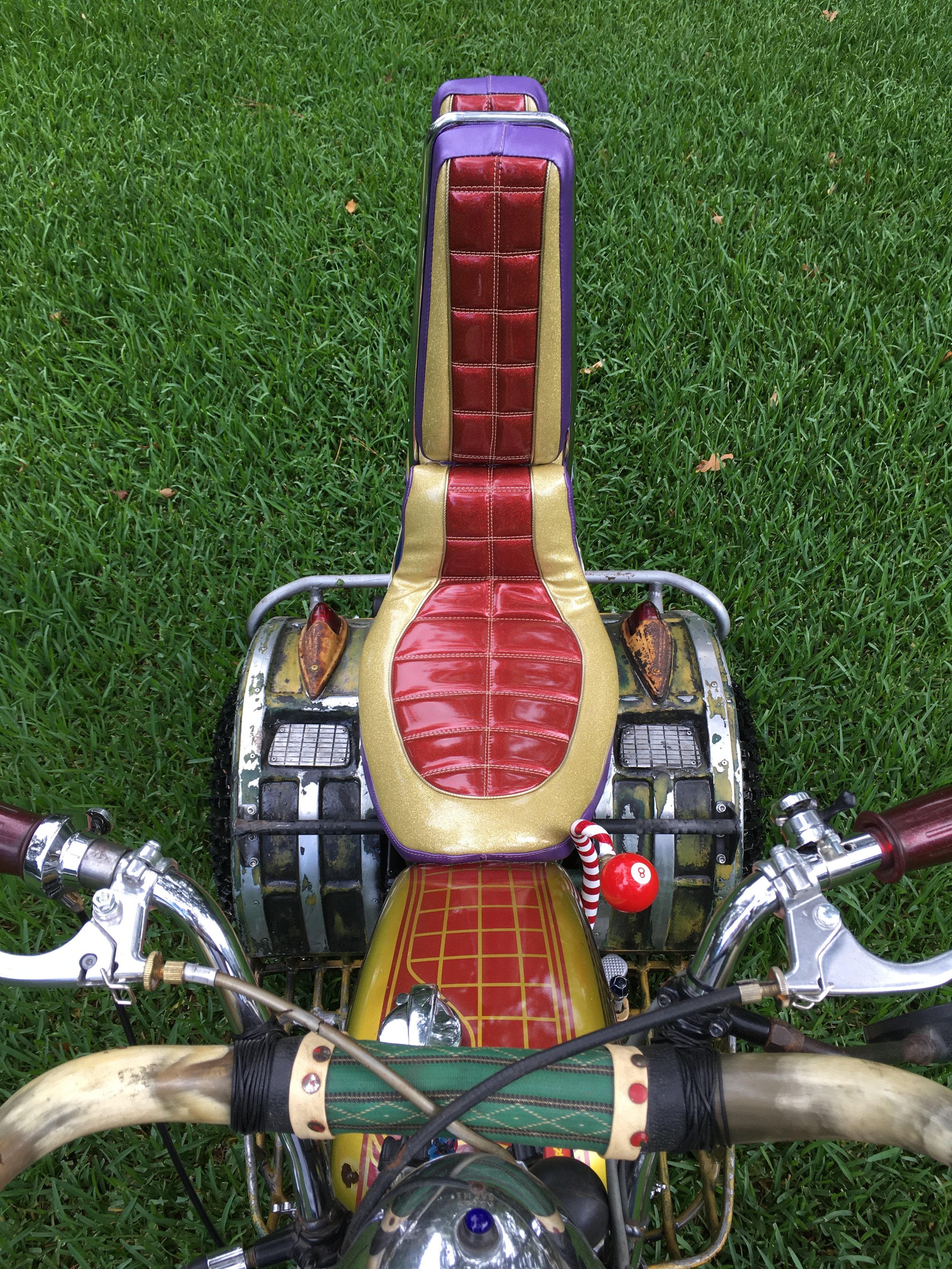 The reproduction 1959 Cadillac tail lights turn signals, and fender marker lamps are all fitted with LED units. The running lights can be switched on and off, or made to flash. The brake lights are actuated by the right handlebar lever or foot brake