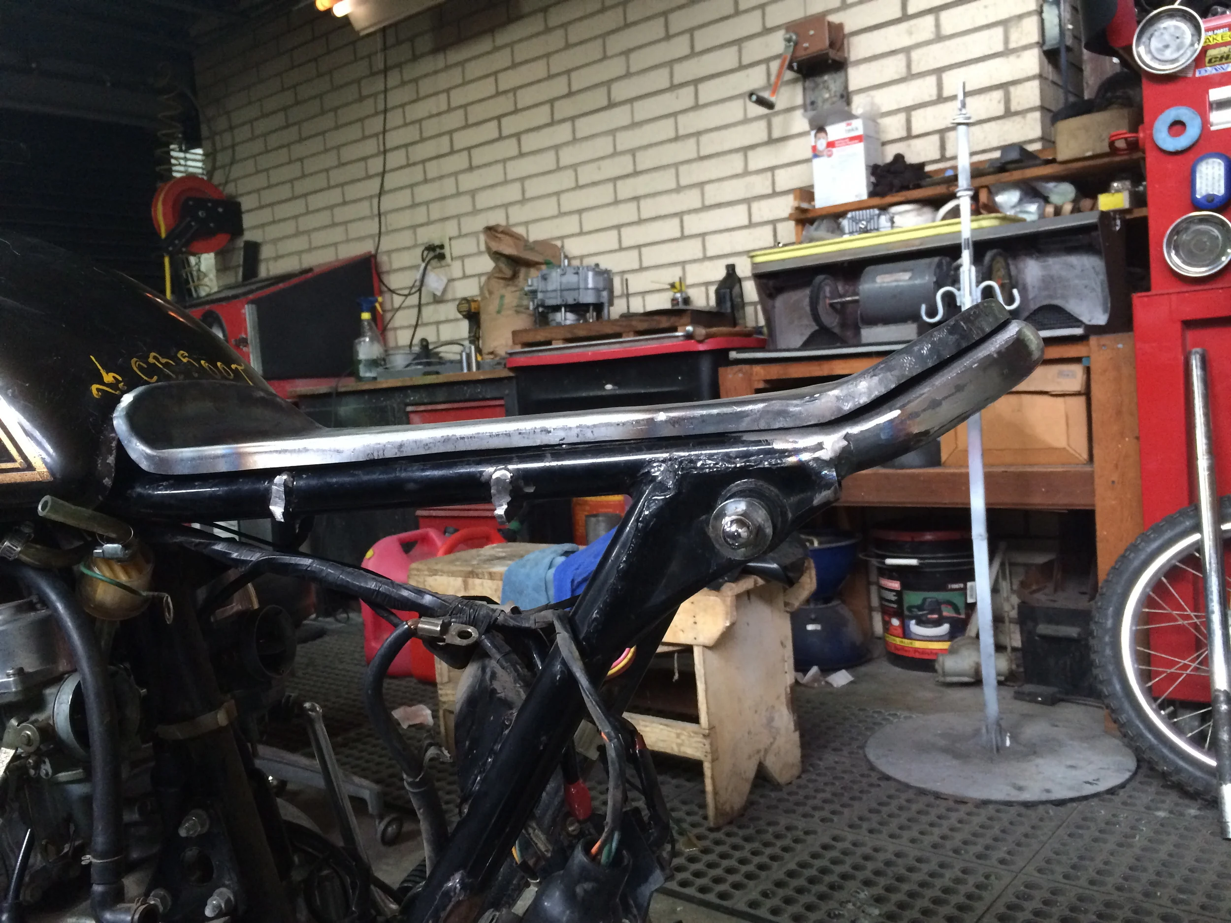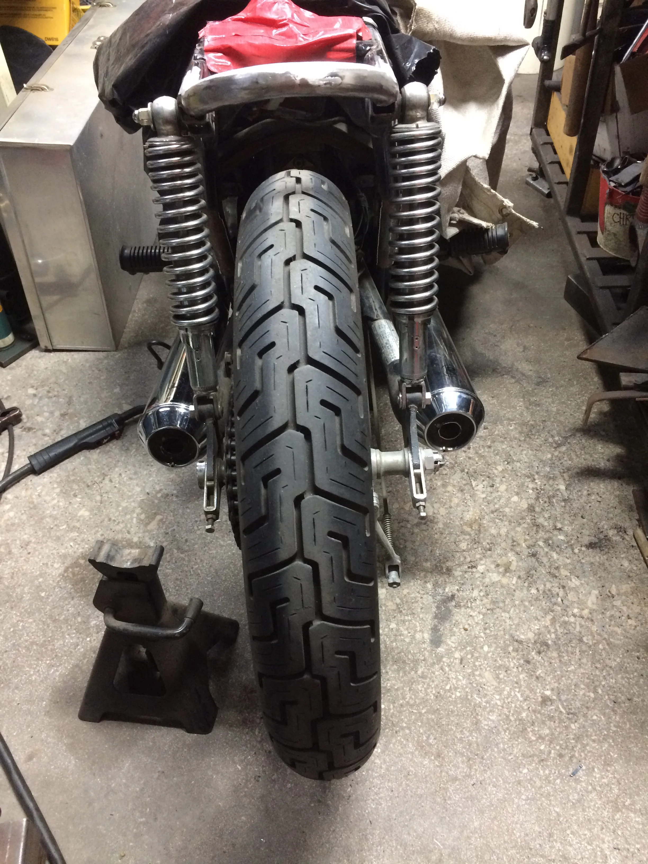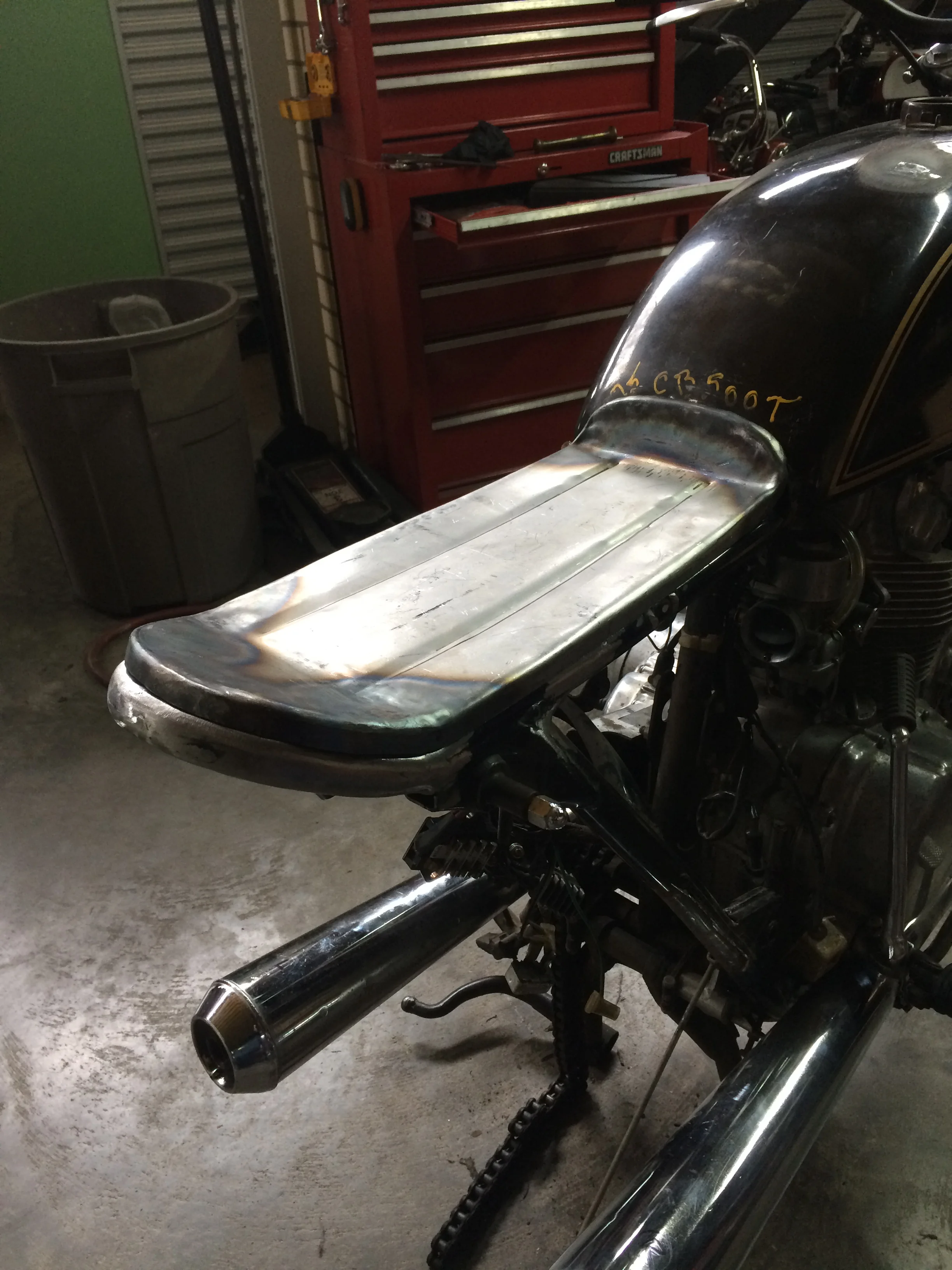 Getting some more done on the 1975 CB500T. An extra used stock muffler was aquired for its clamp. The new cans are in place, and the precise level of tilt decided. The rear end is off the bike in preparation for the fender relocation. The fender will be attached to the swingarm, and float just above the tire. The seat pan has been made and awaits some brackets.The front fender was shortened by taking out a segment in the middle and re-welding.