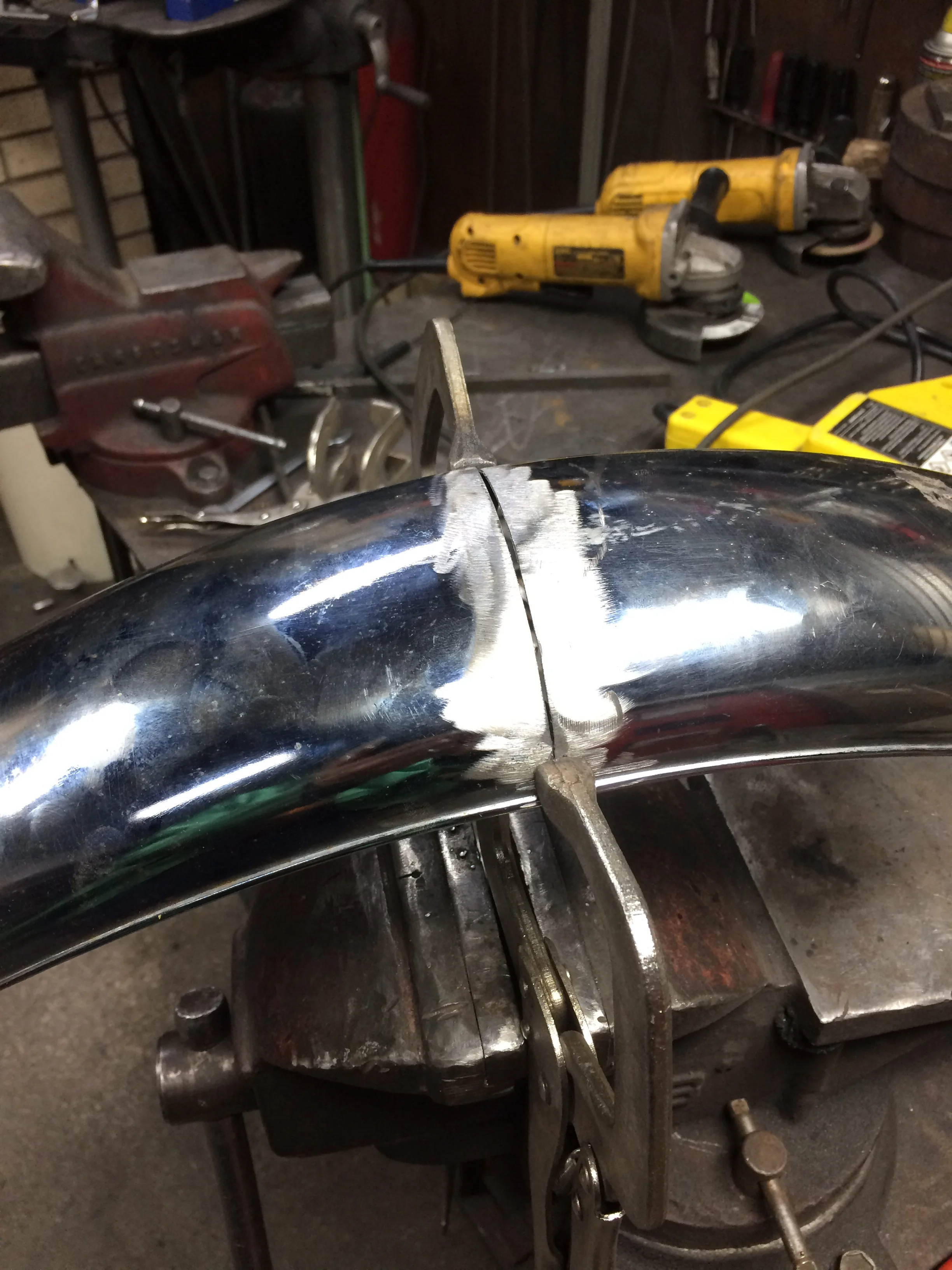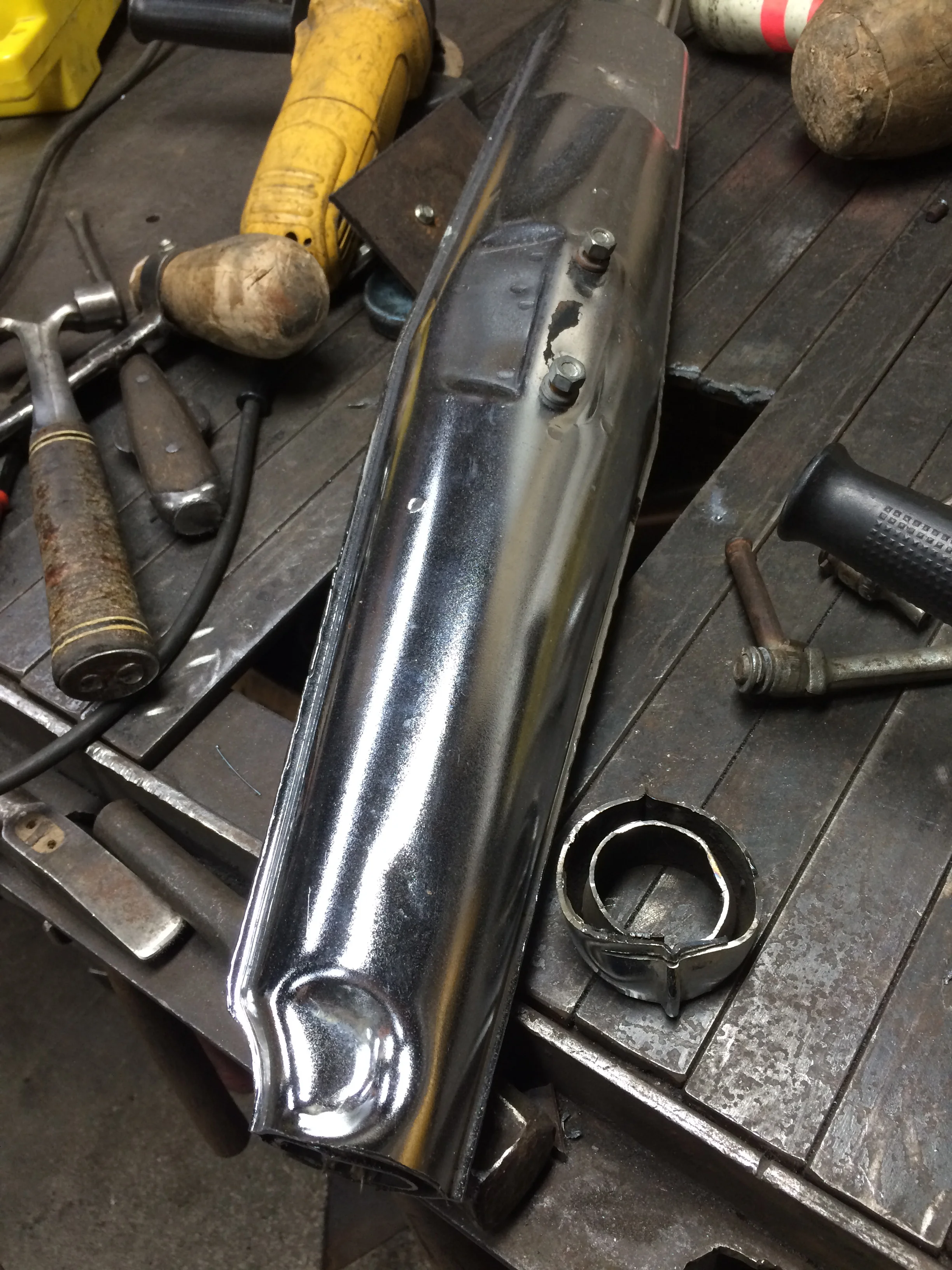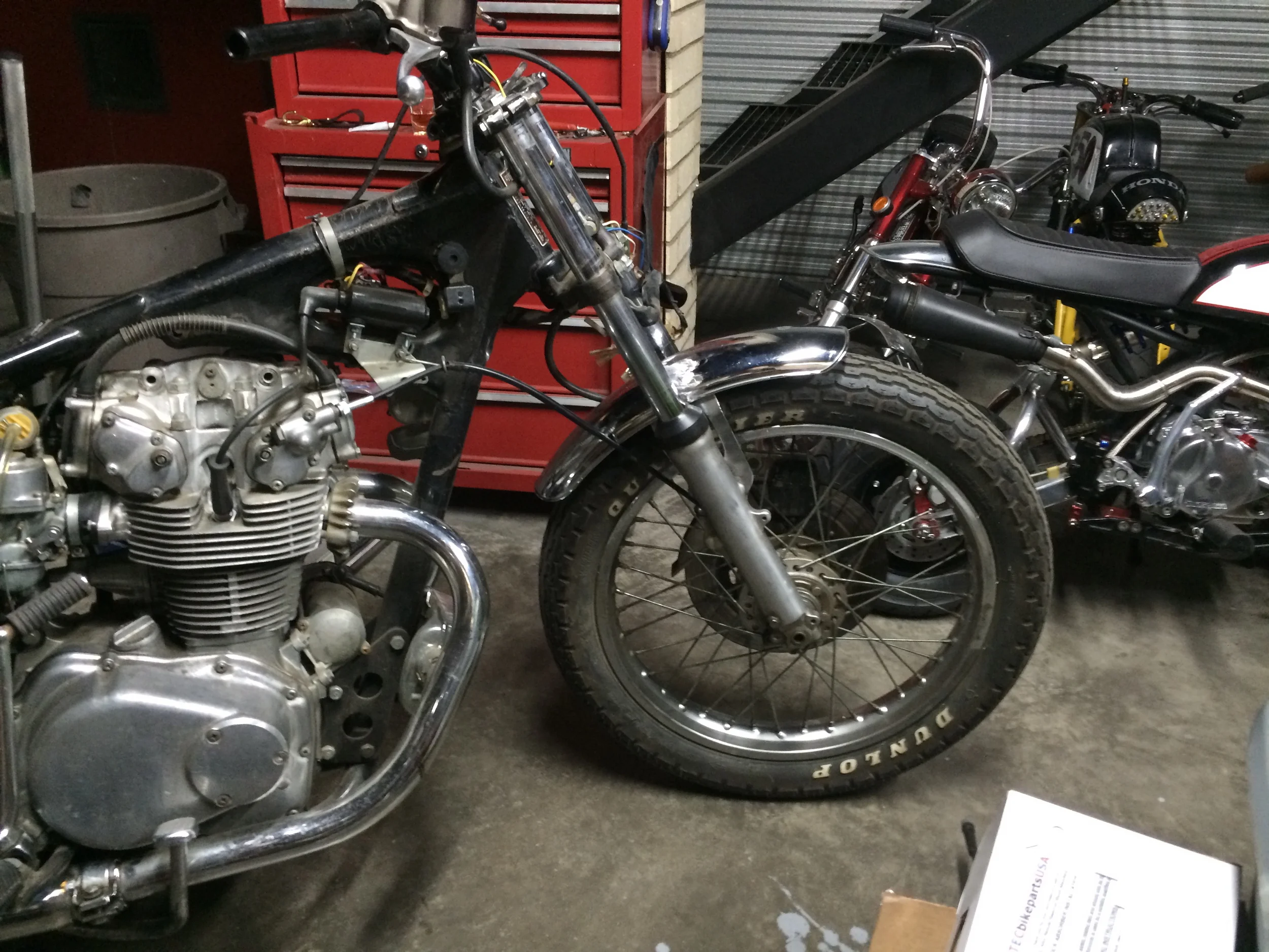 Getting some more done on the 1975 CB500T. An extra used stock muffler was aquired for its clamp. The new cans are in place, and the precise level of tilt decided. The rear end is off the bike in preparation for the fender relocation. The fender will be attached to the swingarm, and float just above the tire. The seat pan has been made and awaits some brackets.The front fender was shortened by taking out a segment in the middle and re-welding.
