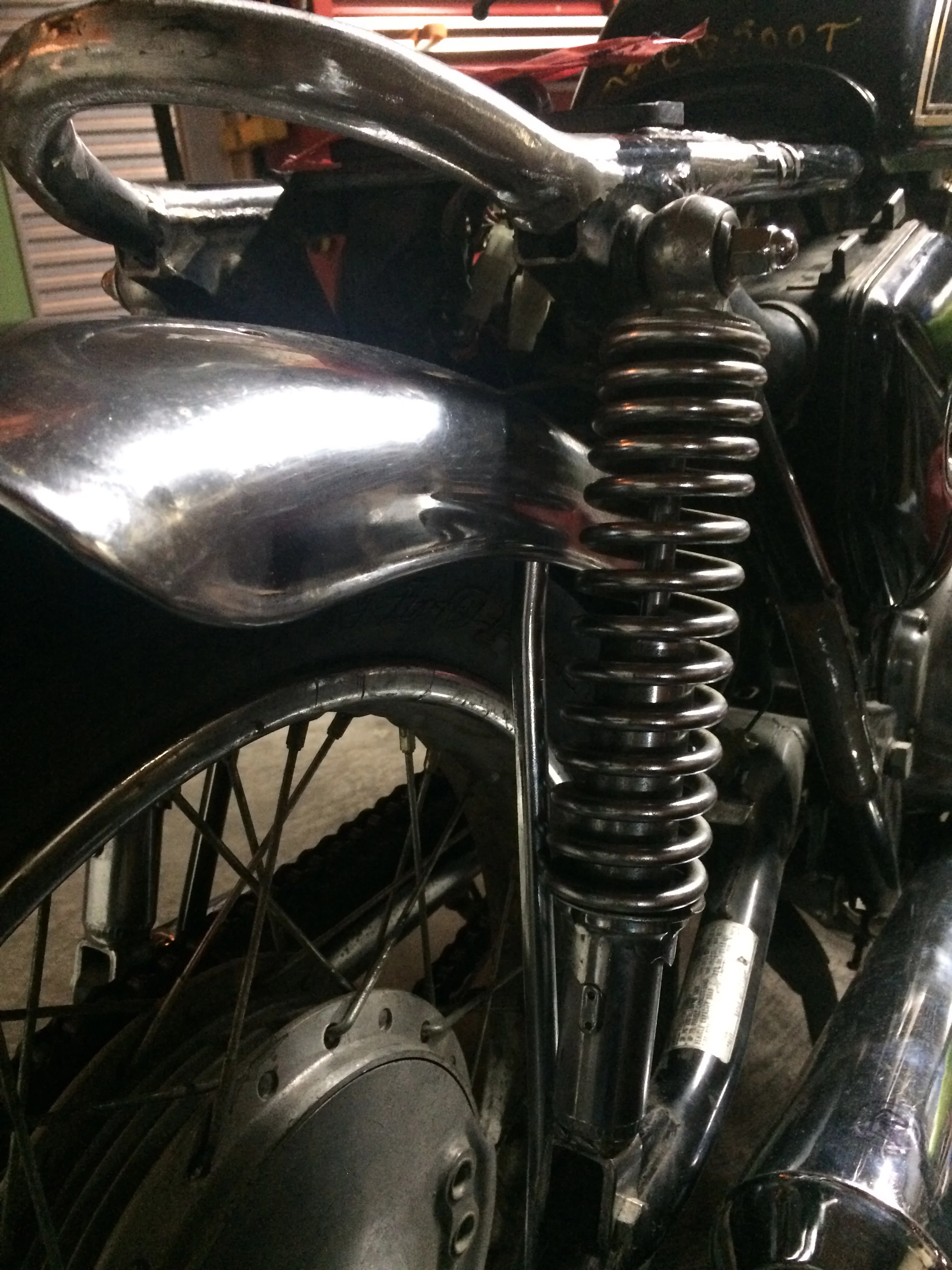 Finished up the fender mounts, the seat latch, the front fender rivets, and one of the two rear fender mounts. Got the headlight bracket made but not mounted. Still need a license plate bracket, a little stopper under the left muffler can for the center stand to rest against, a tunnel under the rear fender to house the tail light wire, and seal some holes on the fender to be done with fabrication.